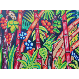 raxxa Premium-Tischset: A single African rhino with bold tribal patterns, standing in a stylized savanna scene painted in African folk art style