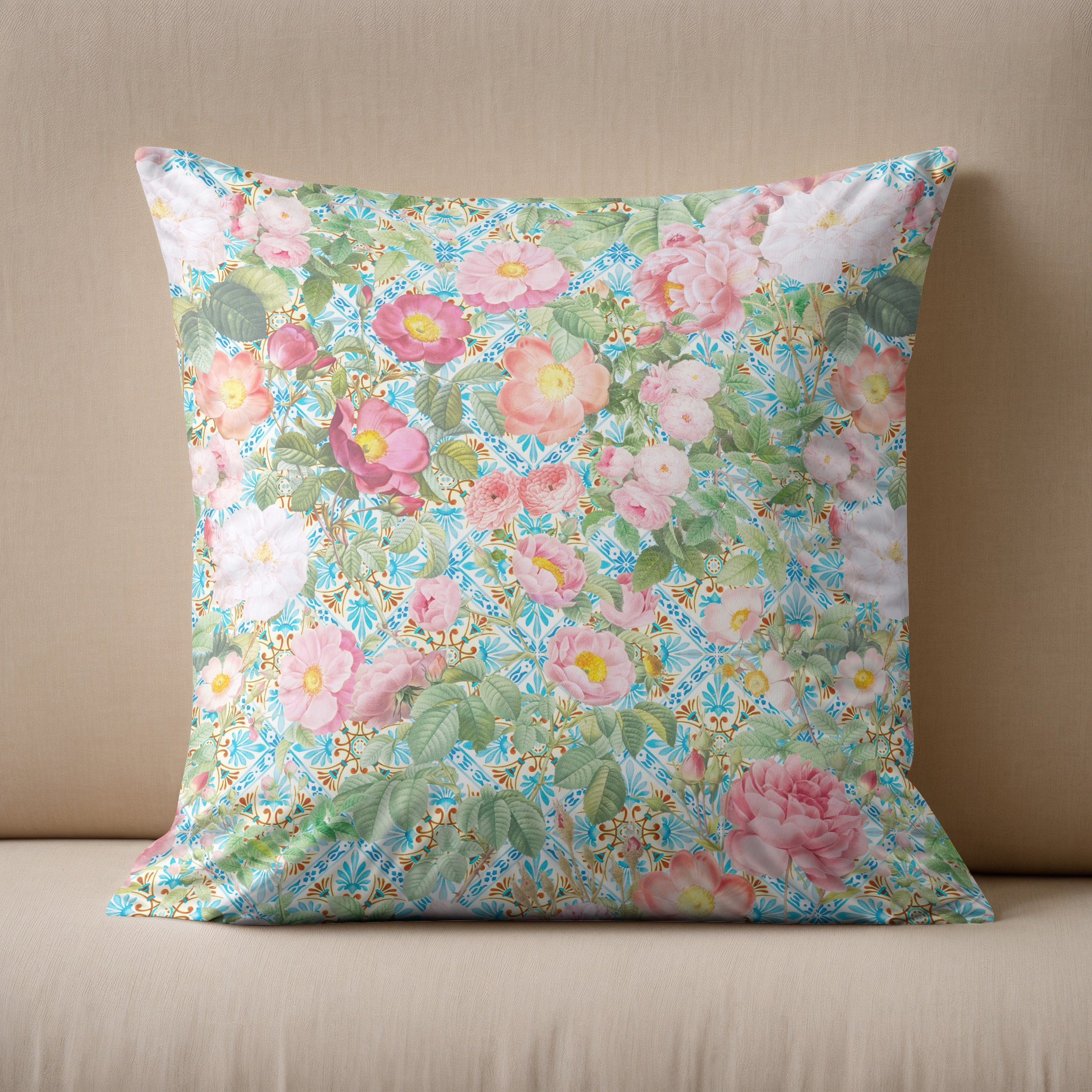 This nostalgic tile pattern in blue and white shows artfully designed, pink Redouté roses surrounded by lush green leaves. It transports you to the romantic world of a Mediterranean summer and evokes memories of carefree vacations on a luxurious finca in Spain or Italy. The contrast between the delicate pink tones of the roses and the clear blue of the sky lends the pattern a timeless elegance. The roses symbolize love and passion and create a romantic and luxurious atmosphere that brings the charm of the Mediterranean summer into every room and exudes an aura of vintage romance.