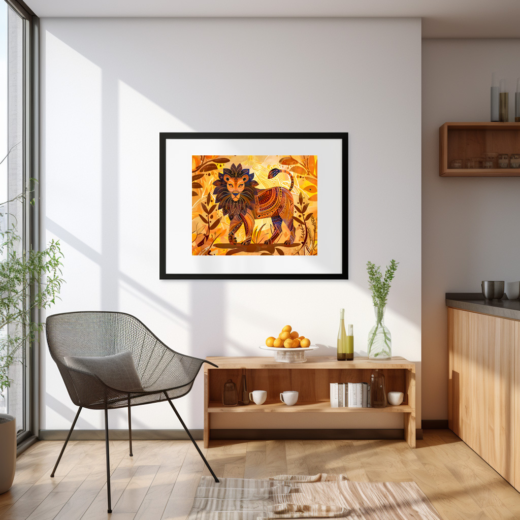 Majestic African lion with richly patterned mane, painted in colorful traditional tribal art style.