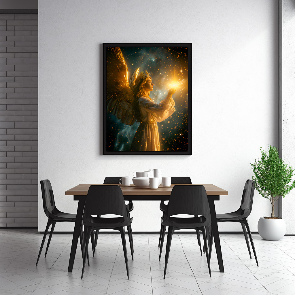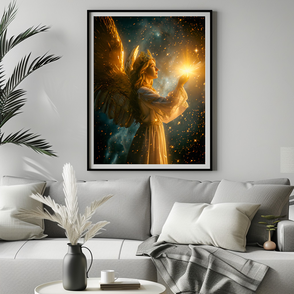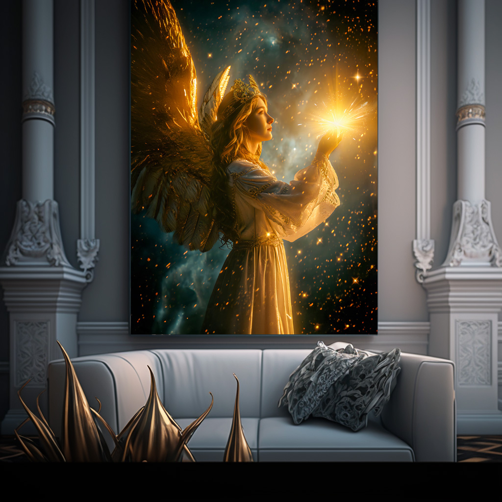 angel cradling a brilliant star in hands, symbolizing celestial guidance and everlasting illumination.