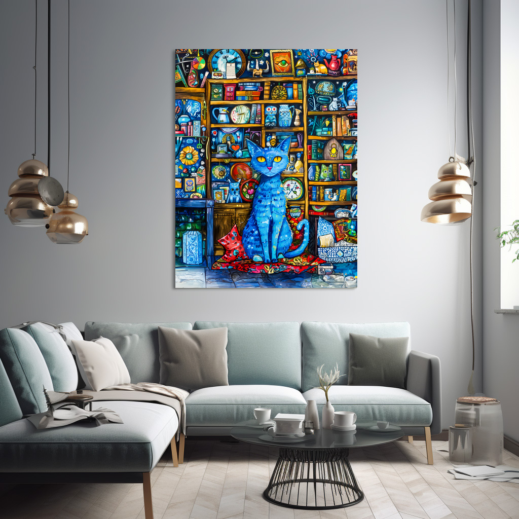 blue-black cat sits in front of a shelf filled with funny, cartoonish items in a modern, bright style.