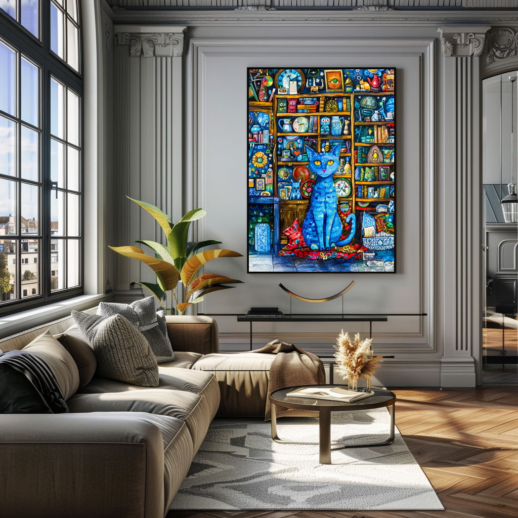 "Blue Cat by Colorful Shelf" by Anja Frost