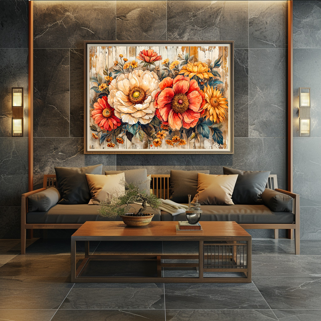 "Cream Peony and Orange Zinnia on Wood" by Anja Frost
