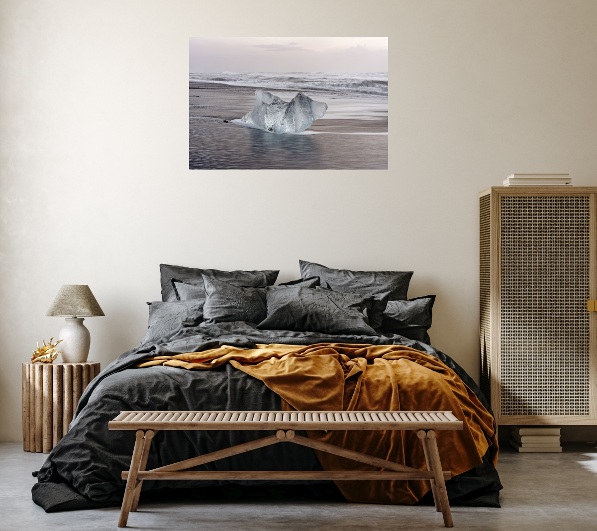 Striking block of ice on a black beach with surf, reflection on the wet sand as the water recedes, waves rolling in the background, soft red tones in the sky and on the wet sand - Location: Iceland, Jökulsarlon (Jökulsárlón)