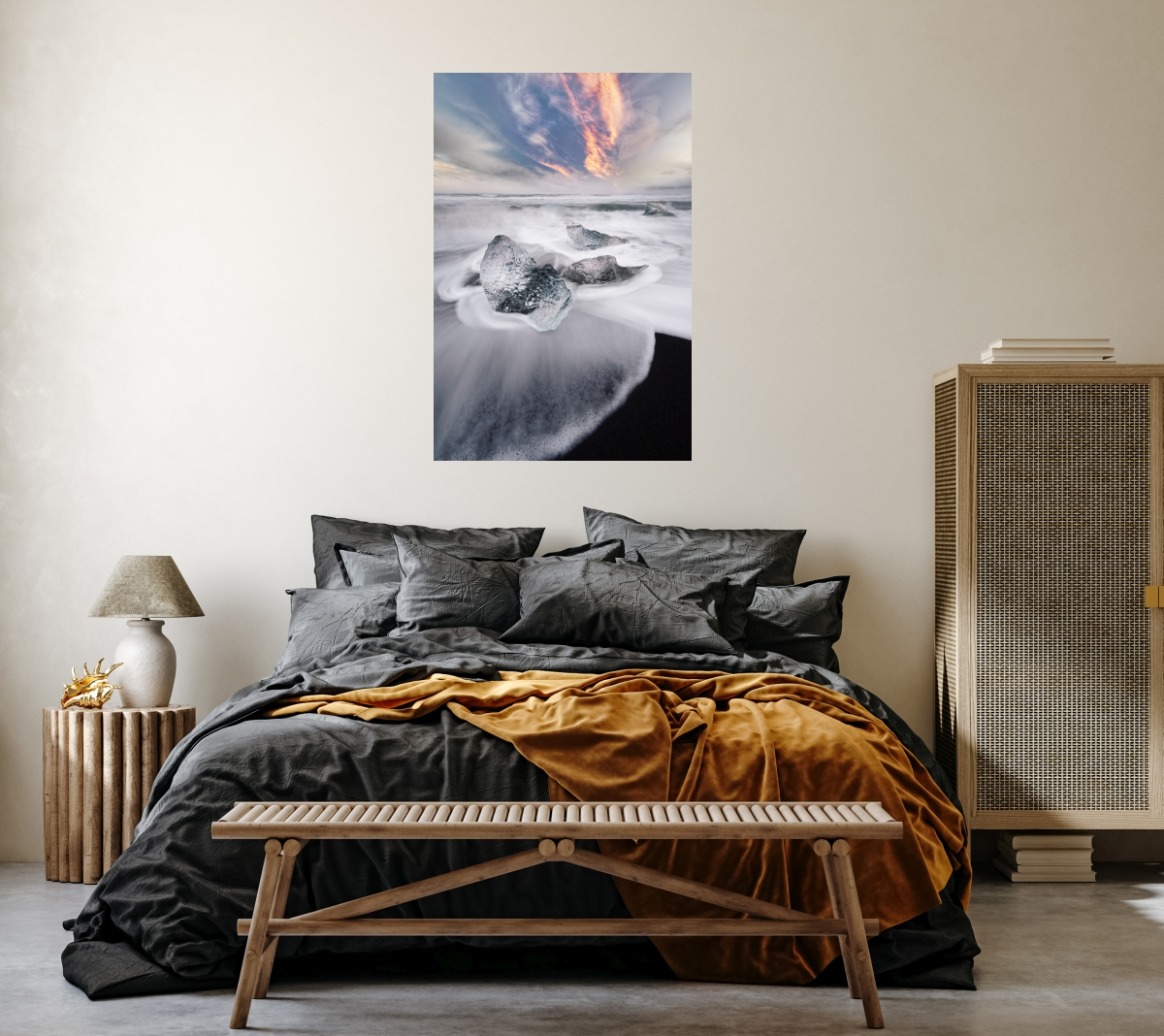 Eisblöcke an einem Strand mit starker Brandung, die Dynamik einer Welle ist zu sehen (Langzeitbelichtung, Bewegungsspuren), darüber markante vom Abendlicht rötlich gefärbte Wolken – Location: Island, Jökulsarlon (Jökulsárlón)