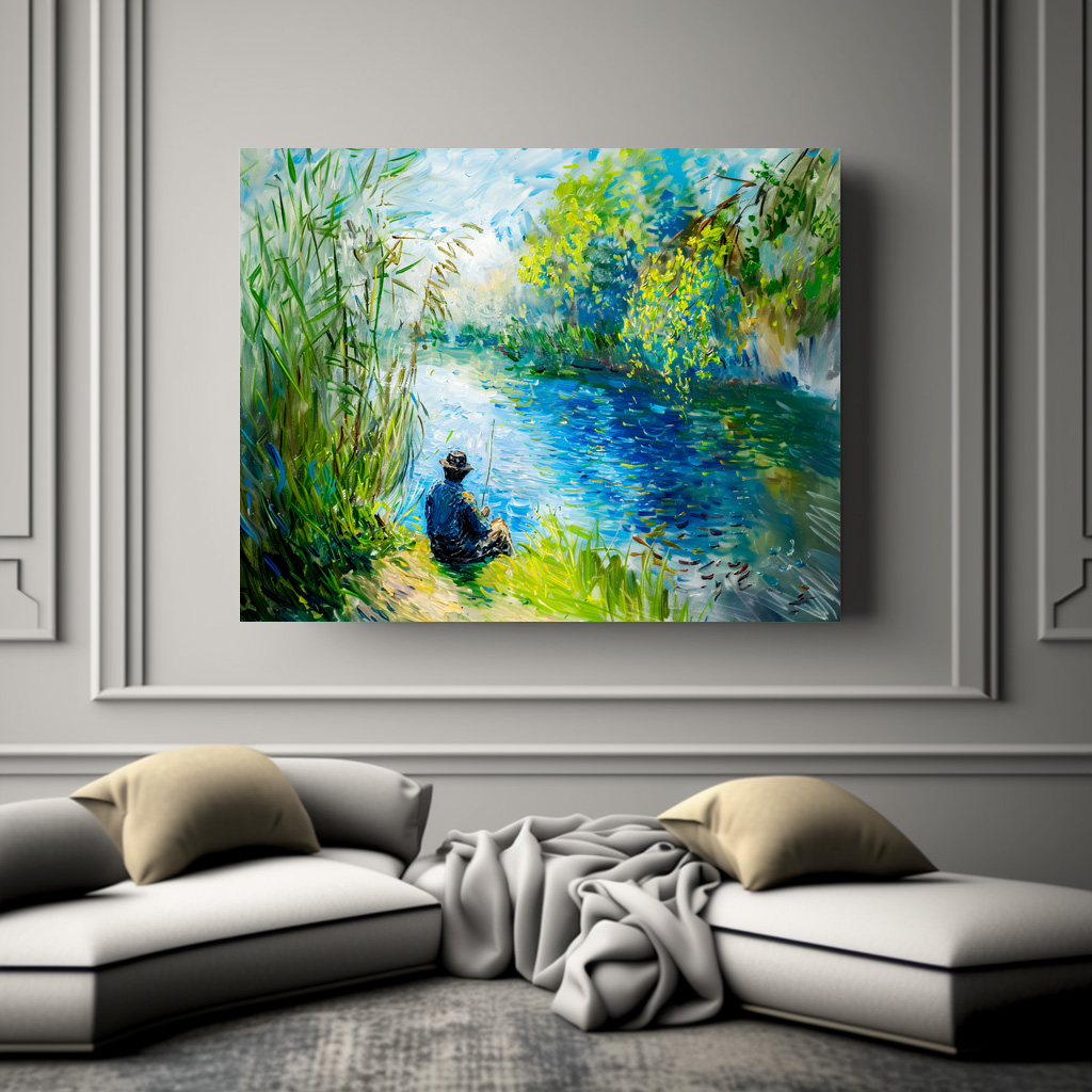 A peaceful scene of an fisherman sitting by the Havel riverbank on a warm summer day. The impressionistic style captures the tranquility and natural beauty of the moment, creating a serene and inviting atmosphere.