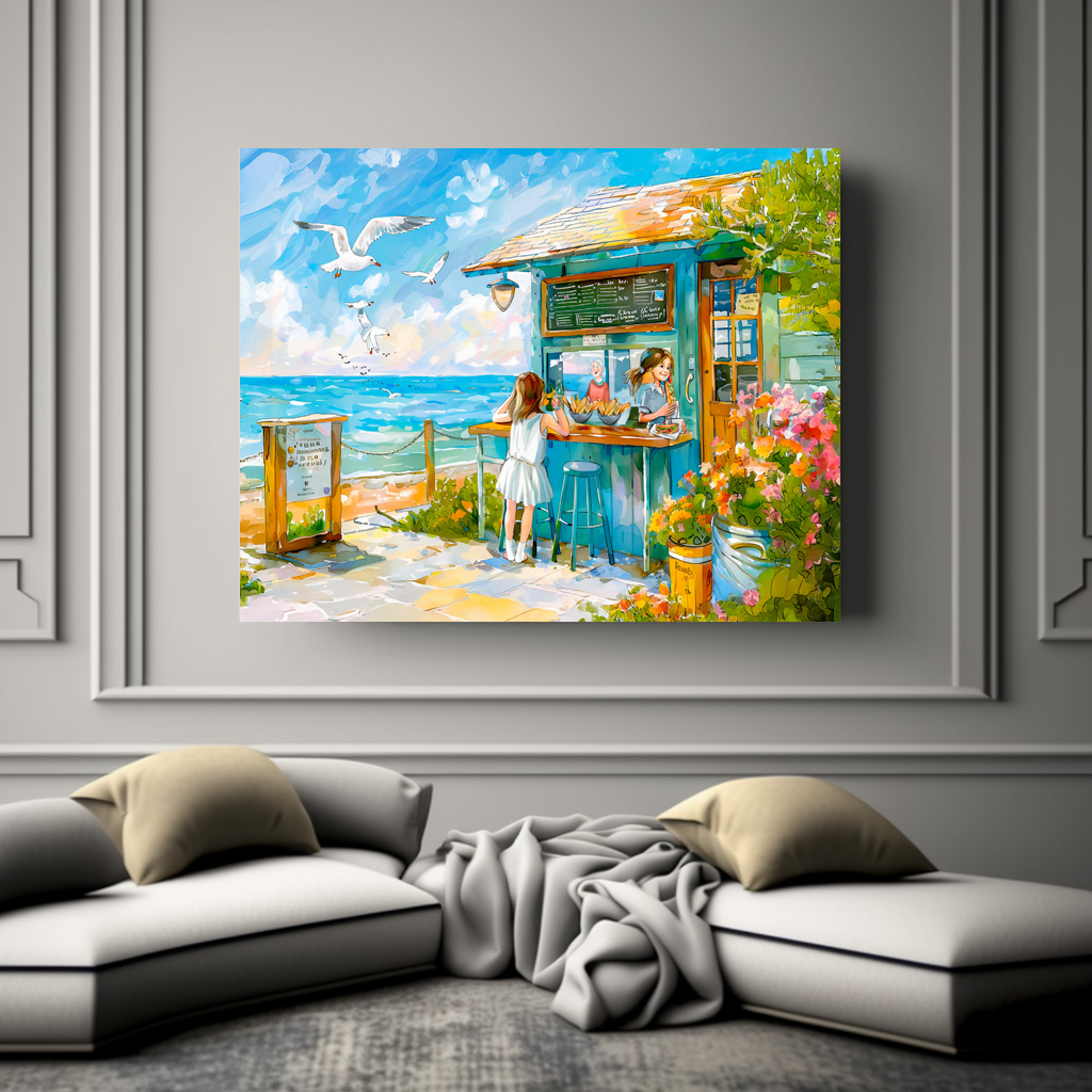 Cheerful watercolor painting of girls eating snakes at a colorful beach snacks by the sea.