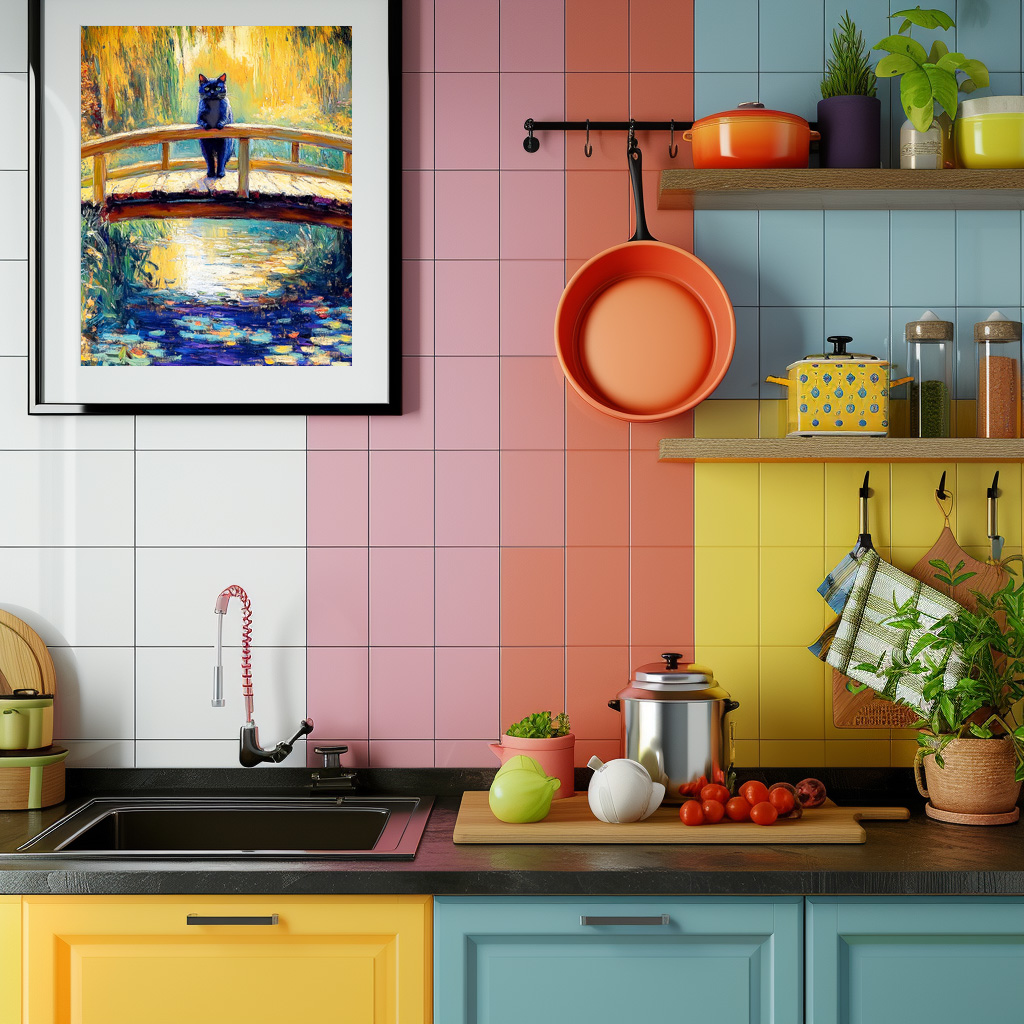 An impressionistic oil painting depicting a black cat standing on a wooden pier by a tranquil pond. Reflections and warm tones create a serene and artistic countryside moment.