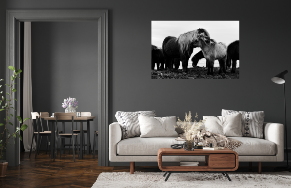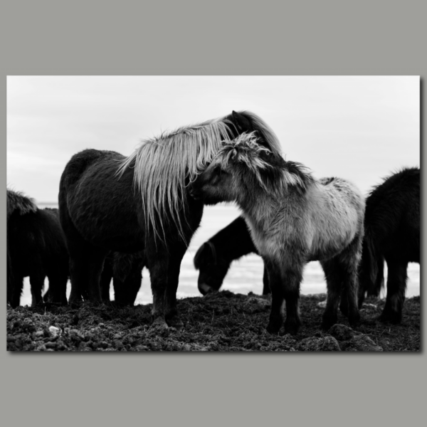Close-up of a group of Icelandic horses in front of a light background as black and white processing, one of the animals is a foal, it nestles its head against an adult animal - Location: Iceland