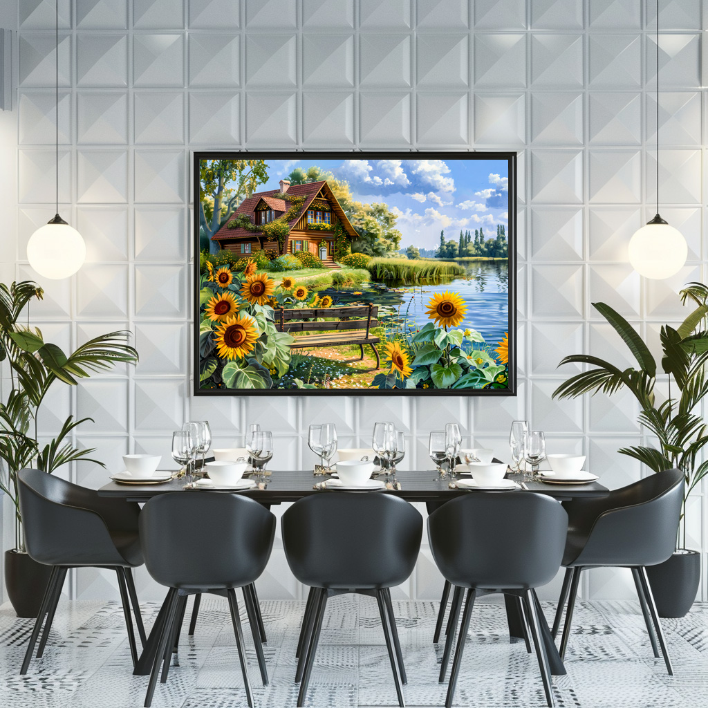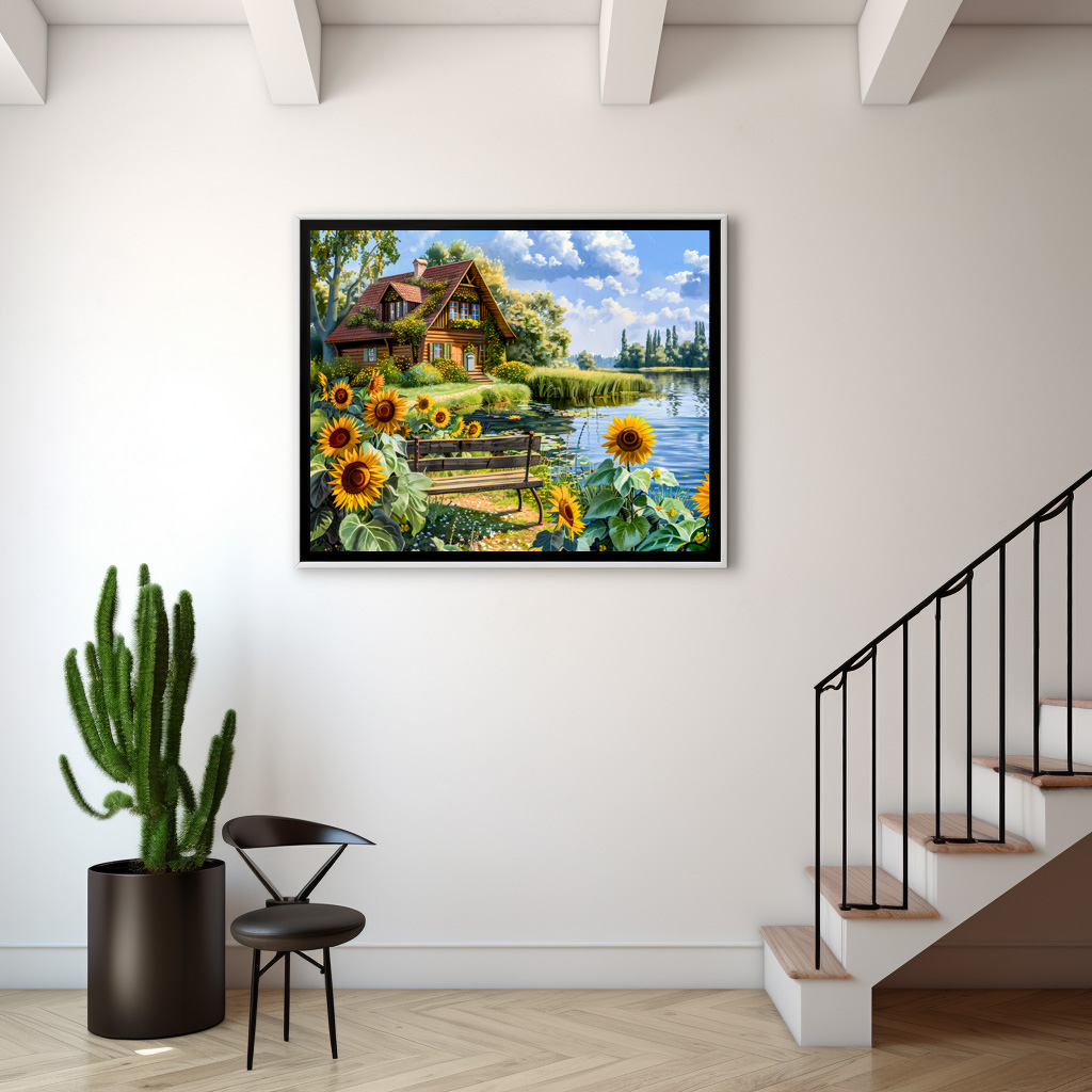 "Lakeside Cottage with Sunflower Field" by Anja Frost