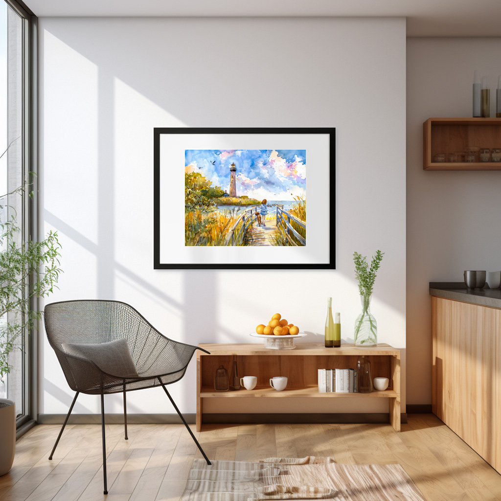 watercolor painting showing a child and a dog walking toward a lighthouse by the ocean on a sunny coastal path.