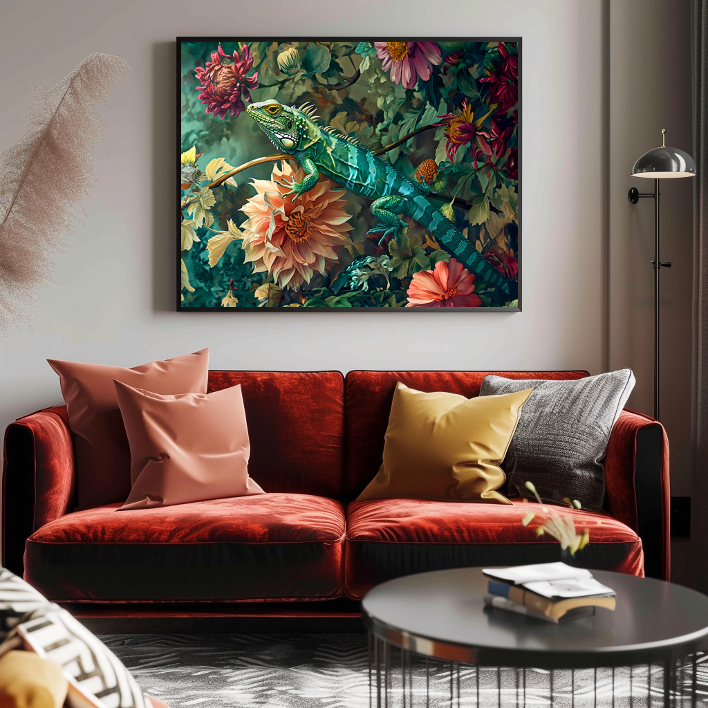 "Lizard Between Dahlia Blooms Garden Illustration" by Anja Frost