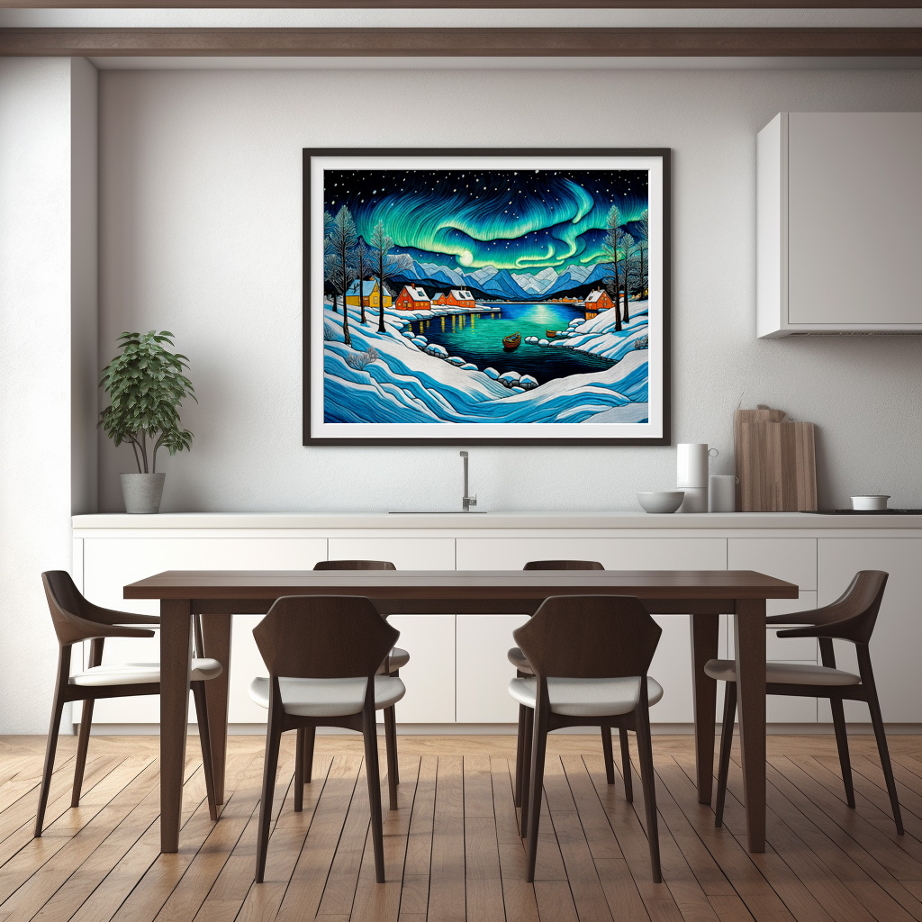 The enchanting Aurora Borealis dancing over a serene winter fjord. Captures the magical beauty of polar landscapes in winter