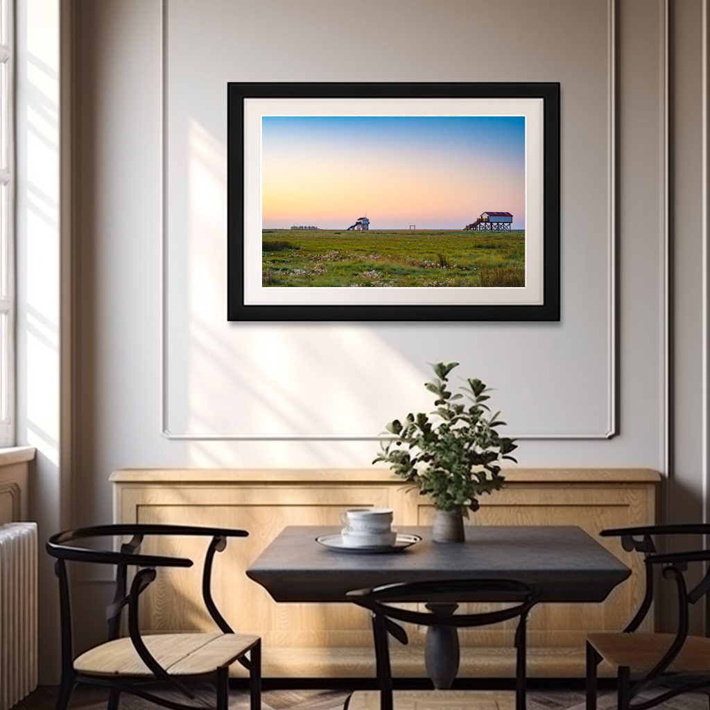 Pfahlbauten an der Nordsee Küste in Sankt Peter Ording am Morgen