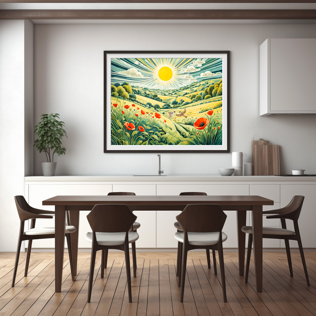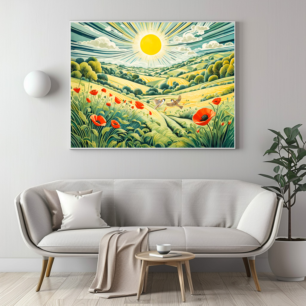winding path through a vibrant poppy field with sparrows flying overhead. The scene captures the beauty and tranquility of a summer day in the countryside.