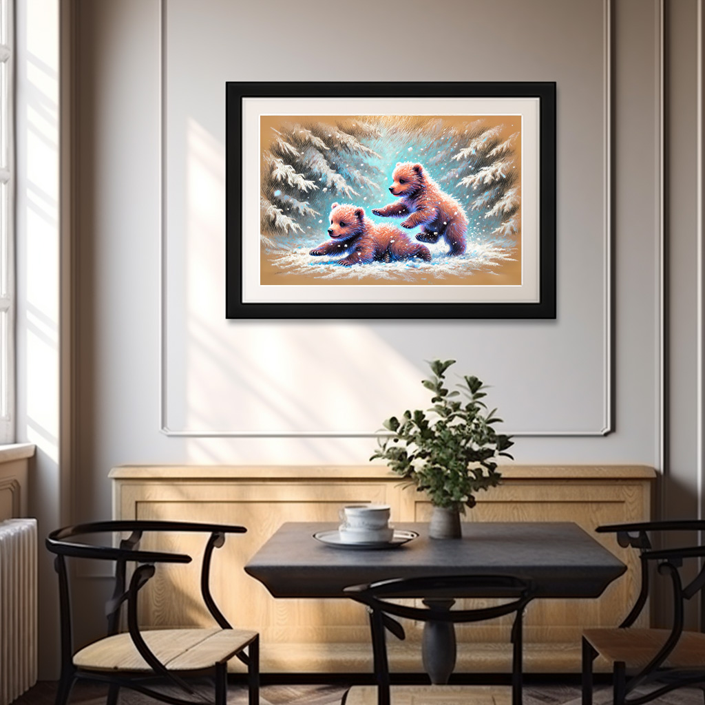 Two adorable bear cubs joyfully play in the snow, surrounded by a peaceful winter forest. This pastel chalk drawing captures the innocence and energy of wildlife in a snowy landscape.