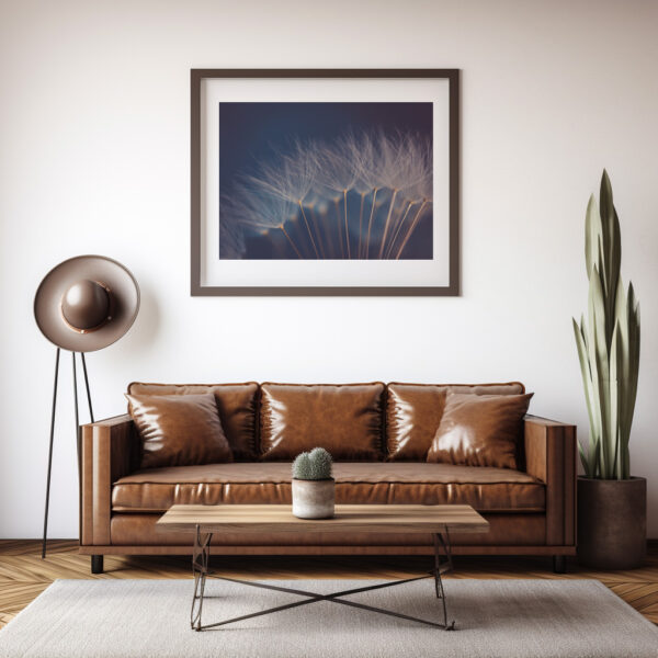 flying seed umbrella of dandelion picks up standing on dark blue background