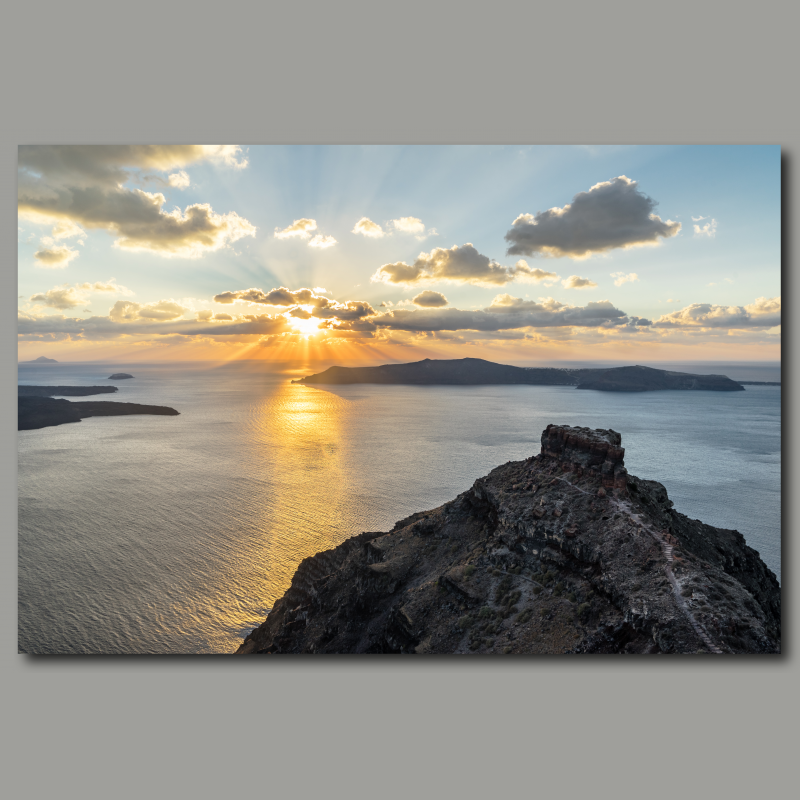 Wide view from the crater rim to a group of islands formed by a large volcanic crater, sunset with rays and smaller clouds - Location: Greece, Cyclades, Santorini (Santorini, Thira)