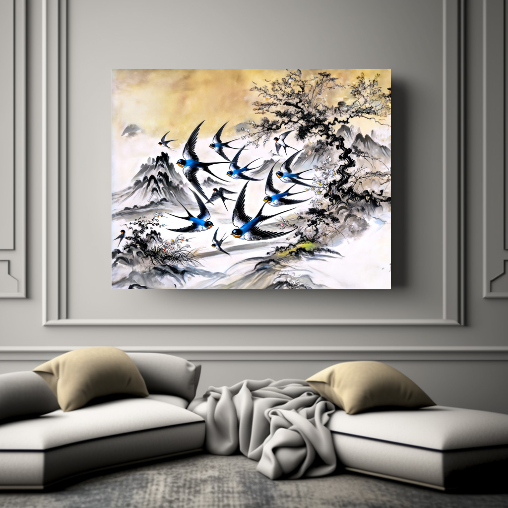 "Swallows Soaring Through the Sky in Chinese Ink Painting" by Anja Frost