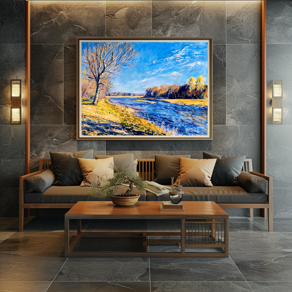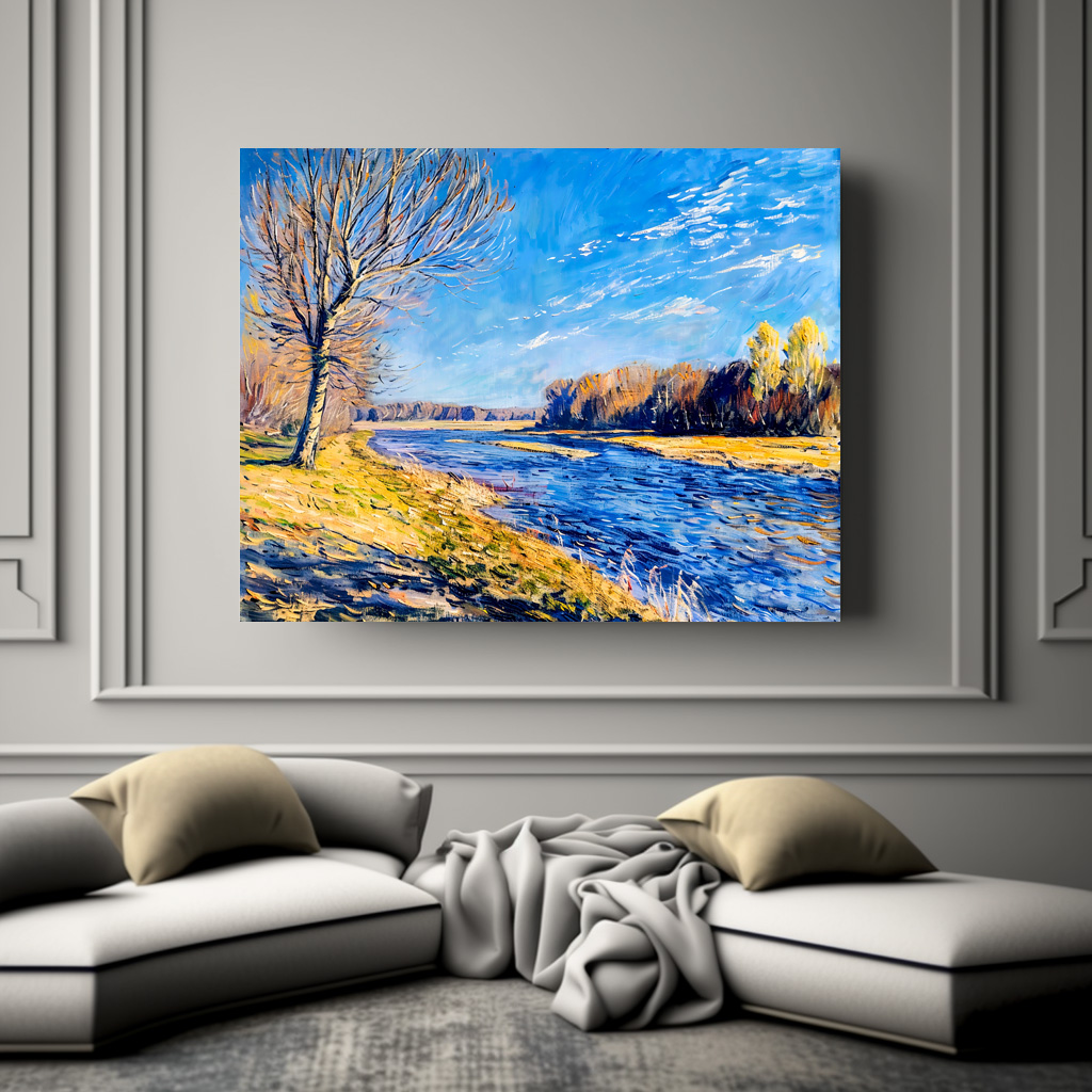 Solitary tree at the bank of a calm river in early spring. Gentle reflections shimmer on the water, surrounded by tender greens and soft sunlight in an impressionistic landscape.