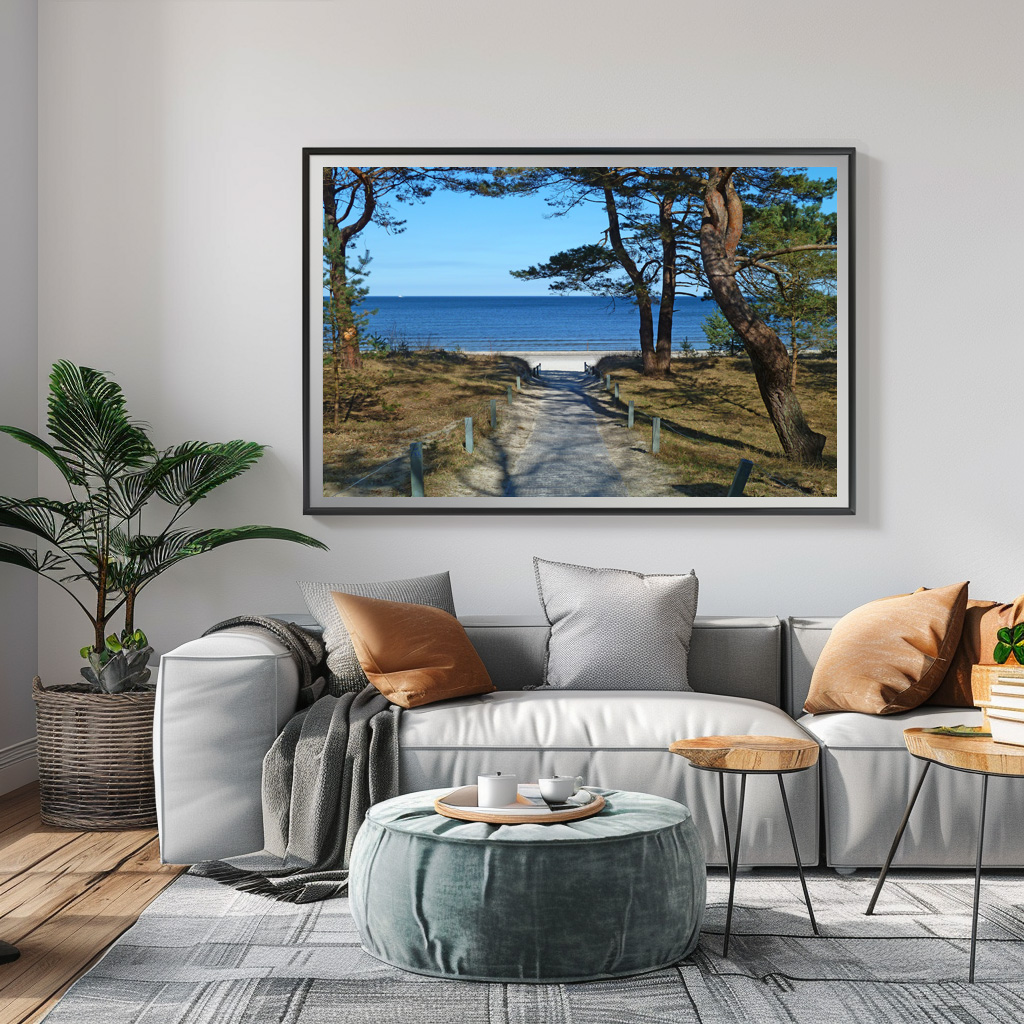 Vacation impression on the Baltic Sea beach in Binz on the beautiful Baltic Sea island of Rügen. The narrow path to the beach leads through pine trees.