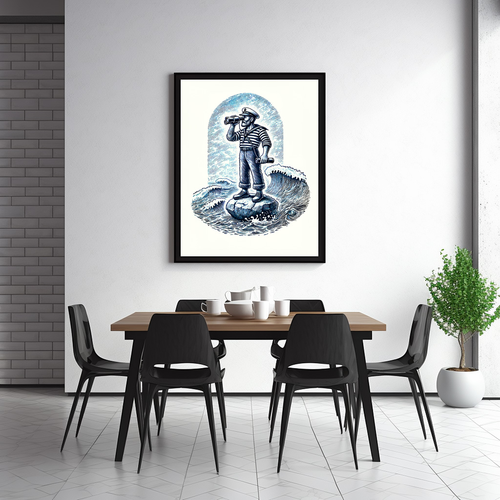 "Vintage Illustration of a Sailor Standing on a Rock Looking Through Binoculars" by Anja Frost