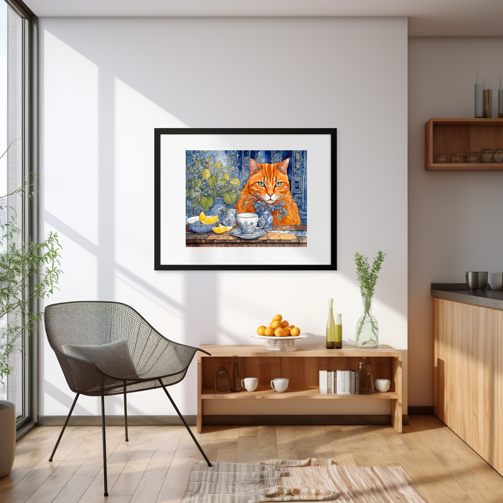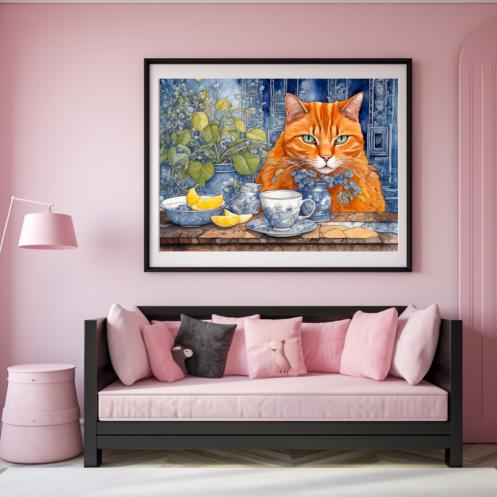 beautiful watercolor artwork featuring an orange tabby cat sitting near a lemon tea set on a rustic blue table. A charming and vibrant scene.