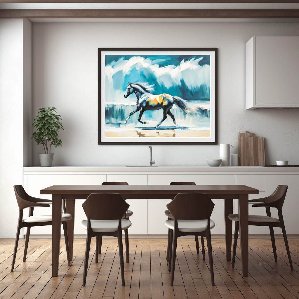 powerful painting of a wild horse running along the shoreline, with crashing waves in the background. The oil painting effect highlights its strength and grace.