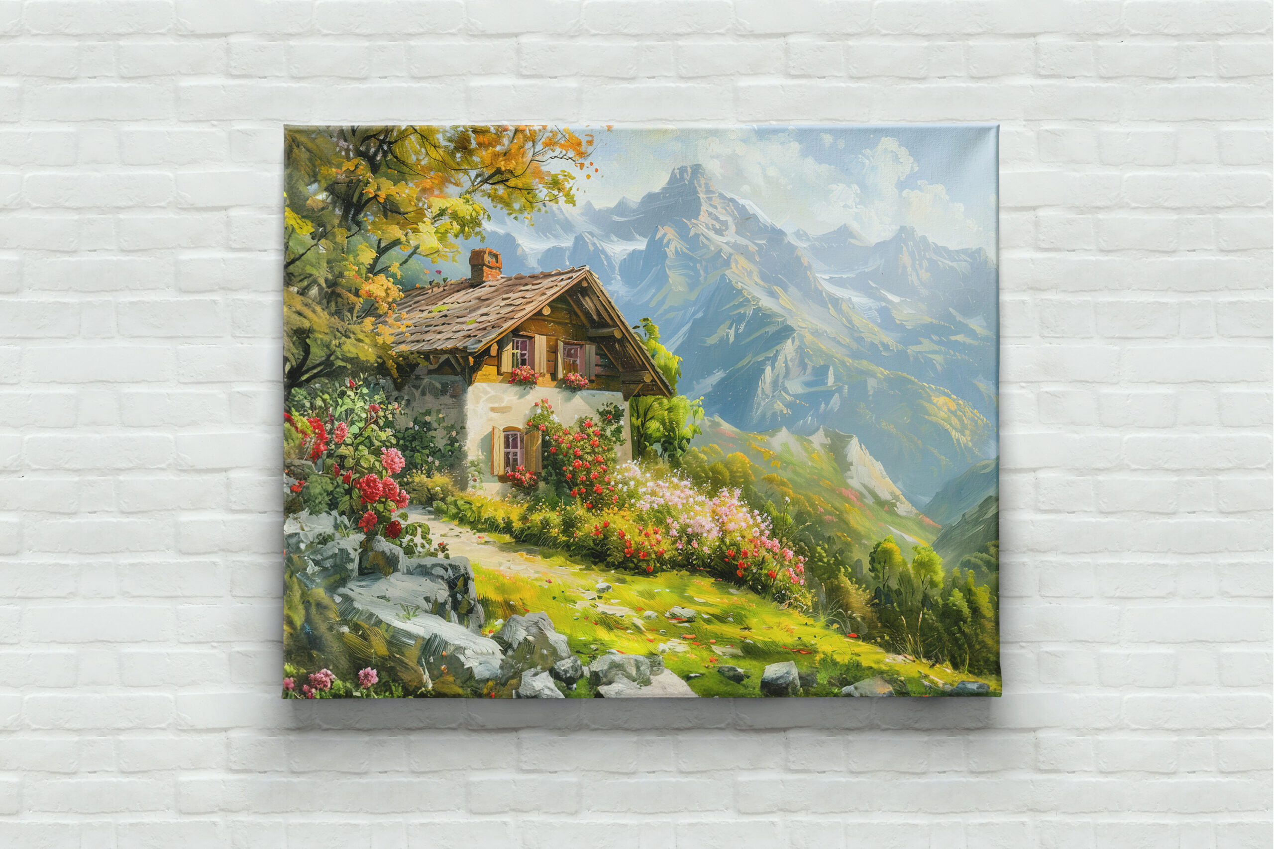 picturesque farmhouse in the Alps with colorful balcony flowers and breathtaking valley views, painted in vibrant oil painting strokes.