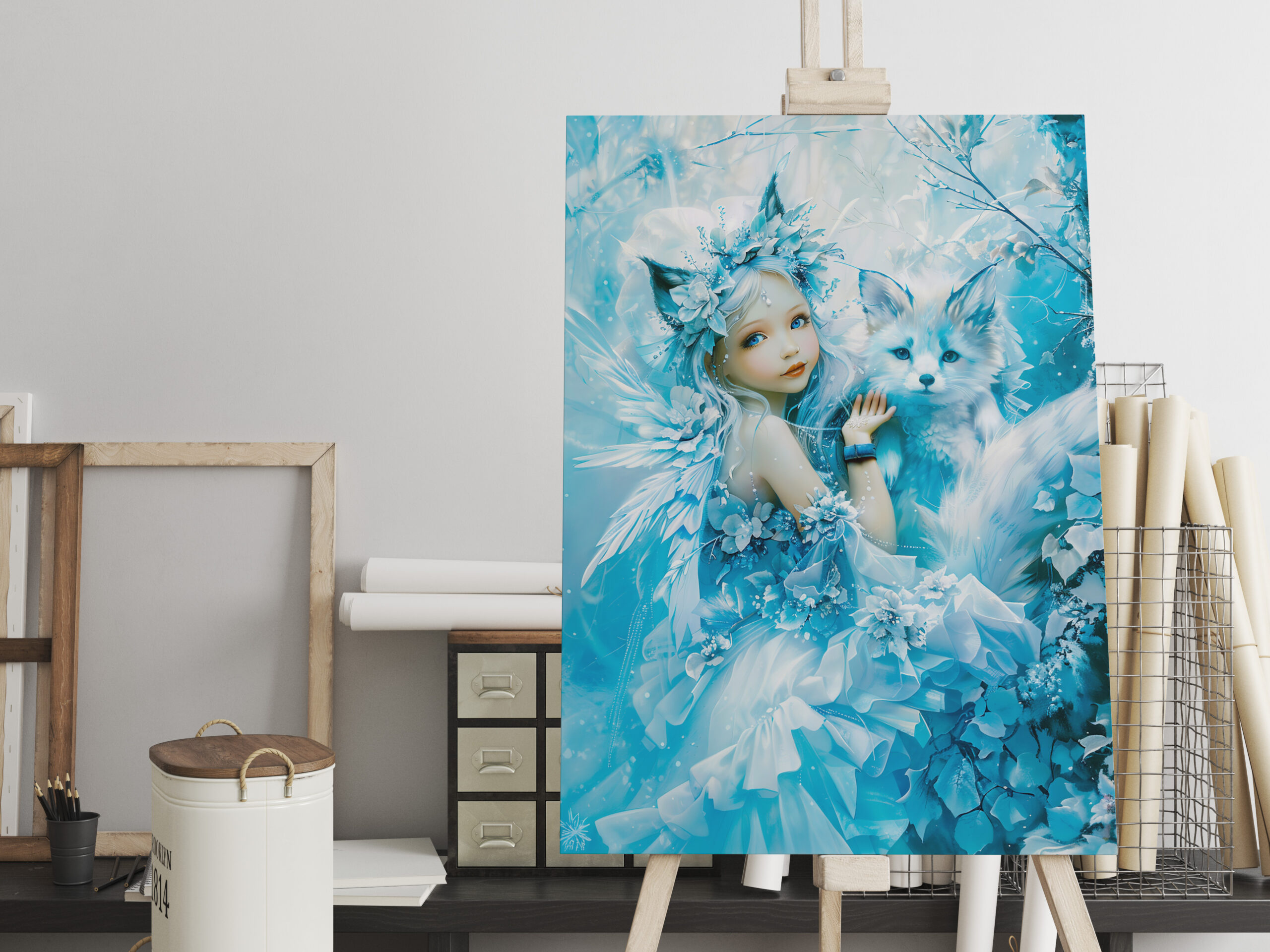 serene fairy rests by a frozen lake, accompanied by a playful polar fox. The pastel chalk art evokes an enchanting arctic fairyland scene.