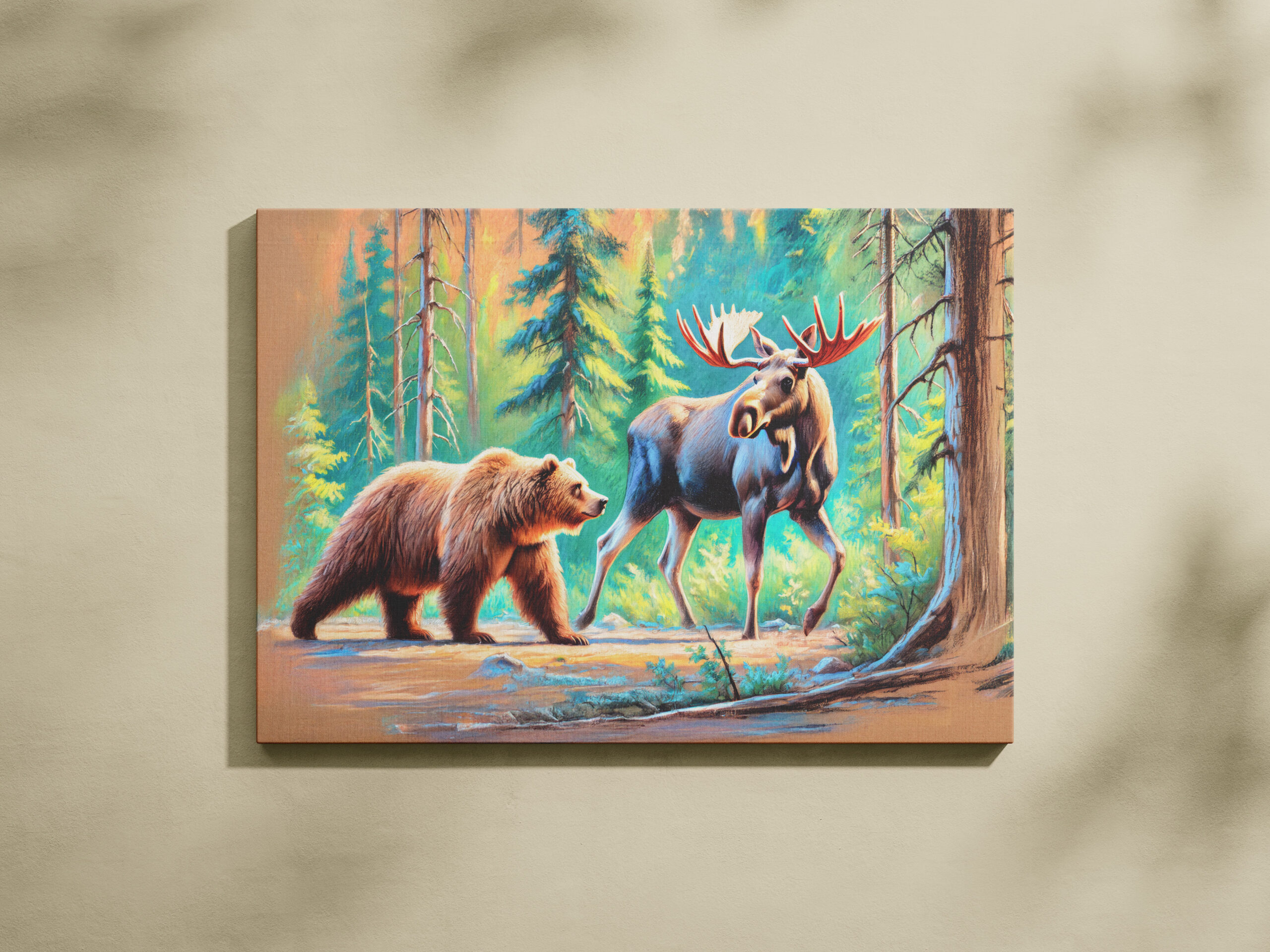 Bear and moose encounter in a lush forest, captured in vibrant pastel chalk. The scene highlights the beauty of wildlife and natures harmony.