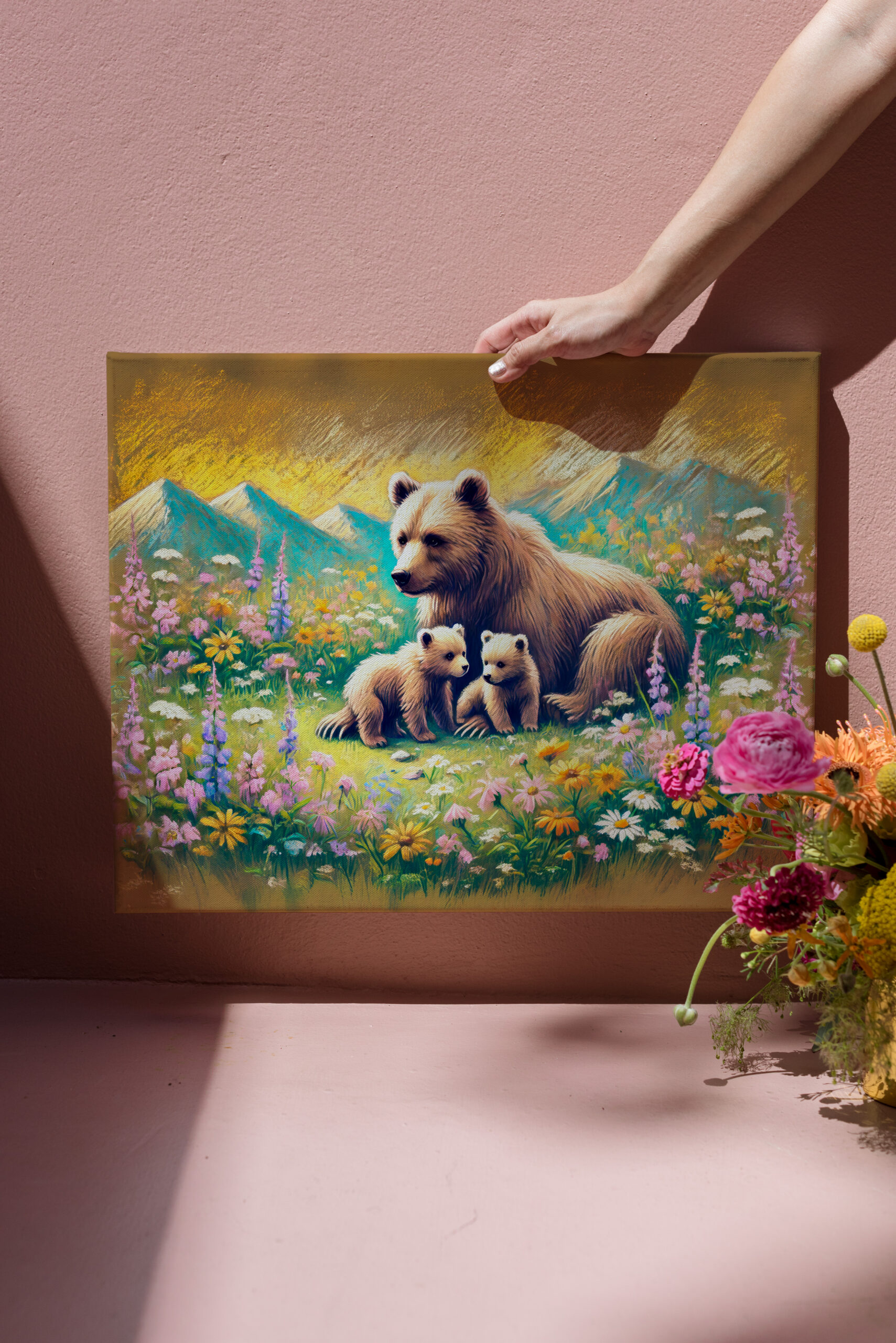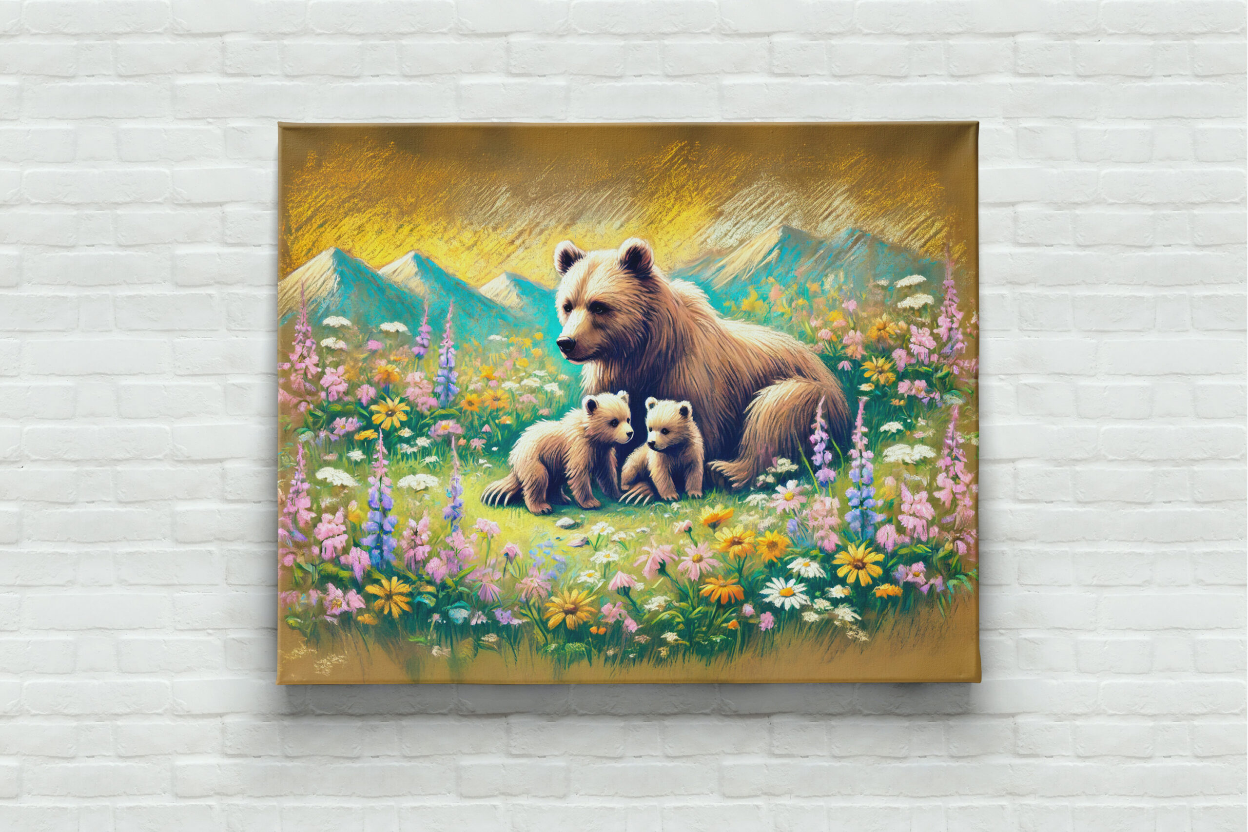 mother bear with her cubs in a vibrant mountain meadow filled with wildflowers, captured in soft pastel chalk. The scene radiates warmth, love, and the beauty of nature.