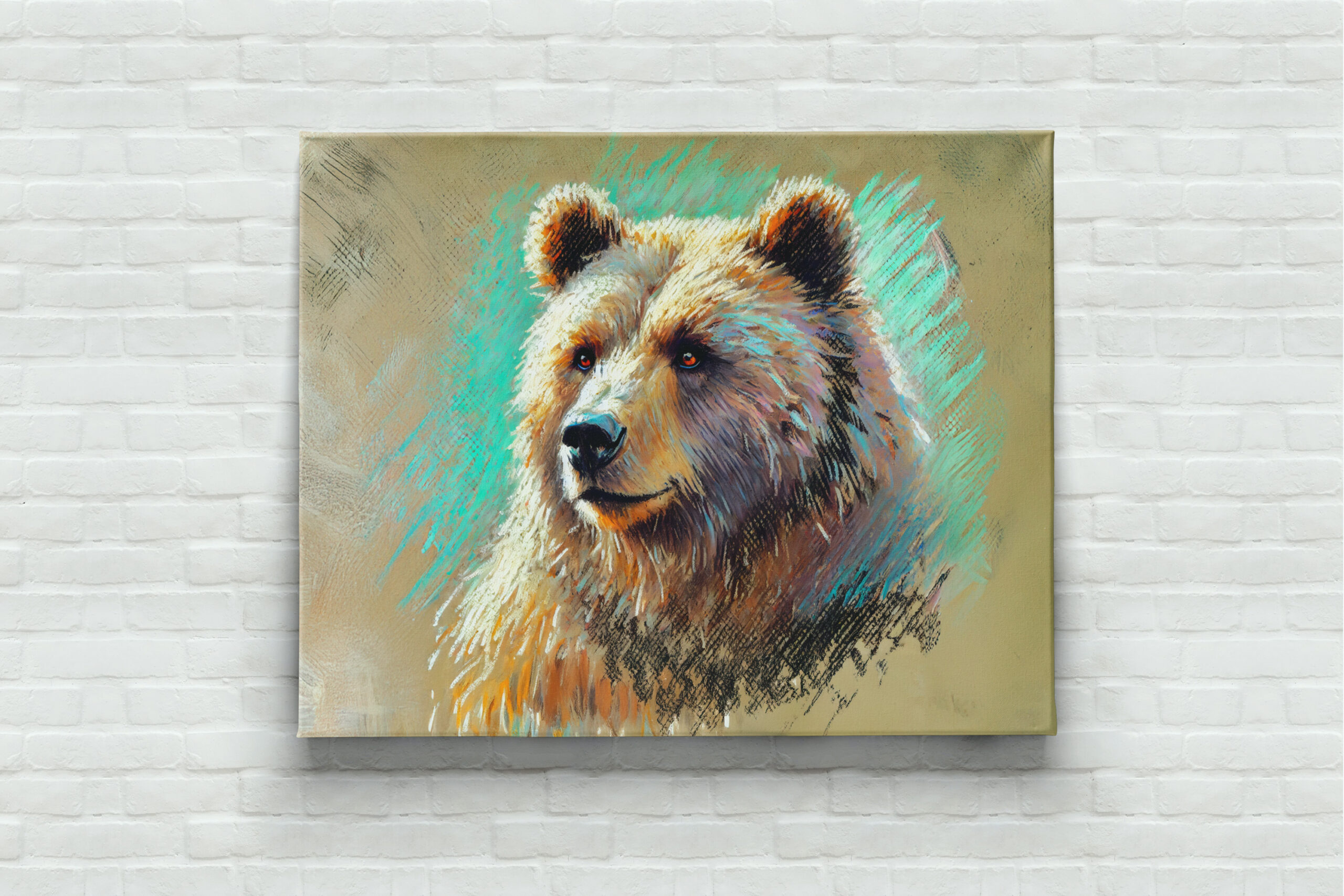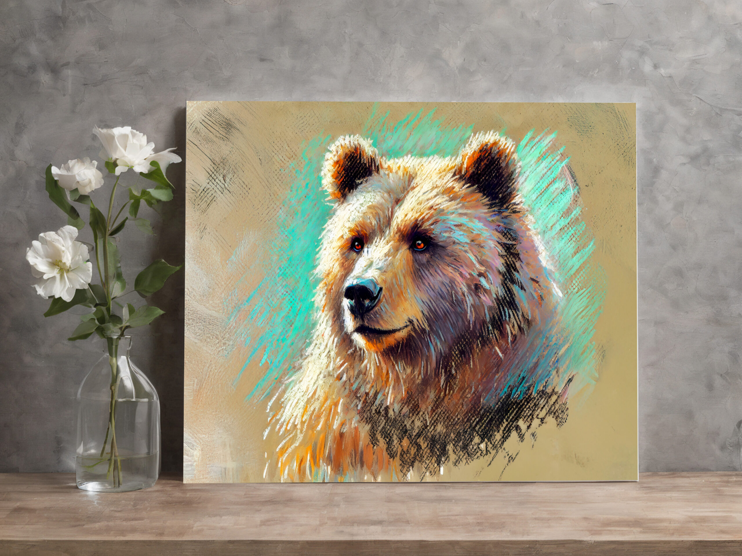 detailed pastel chalk portrait of a brown bear, capturing its majestic presence with vibrant colors and textures. Perfect for nature-inspired art.