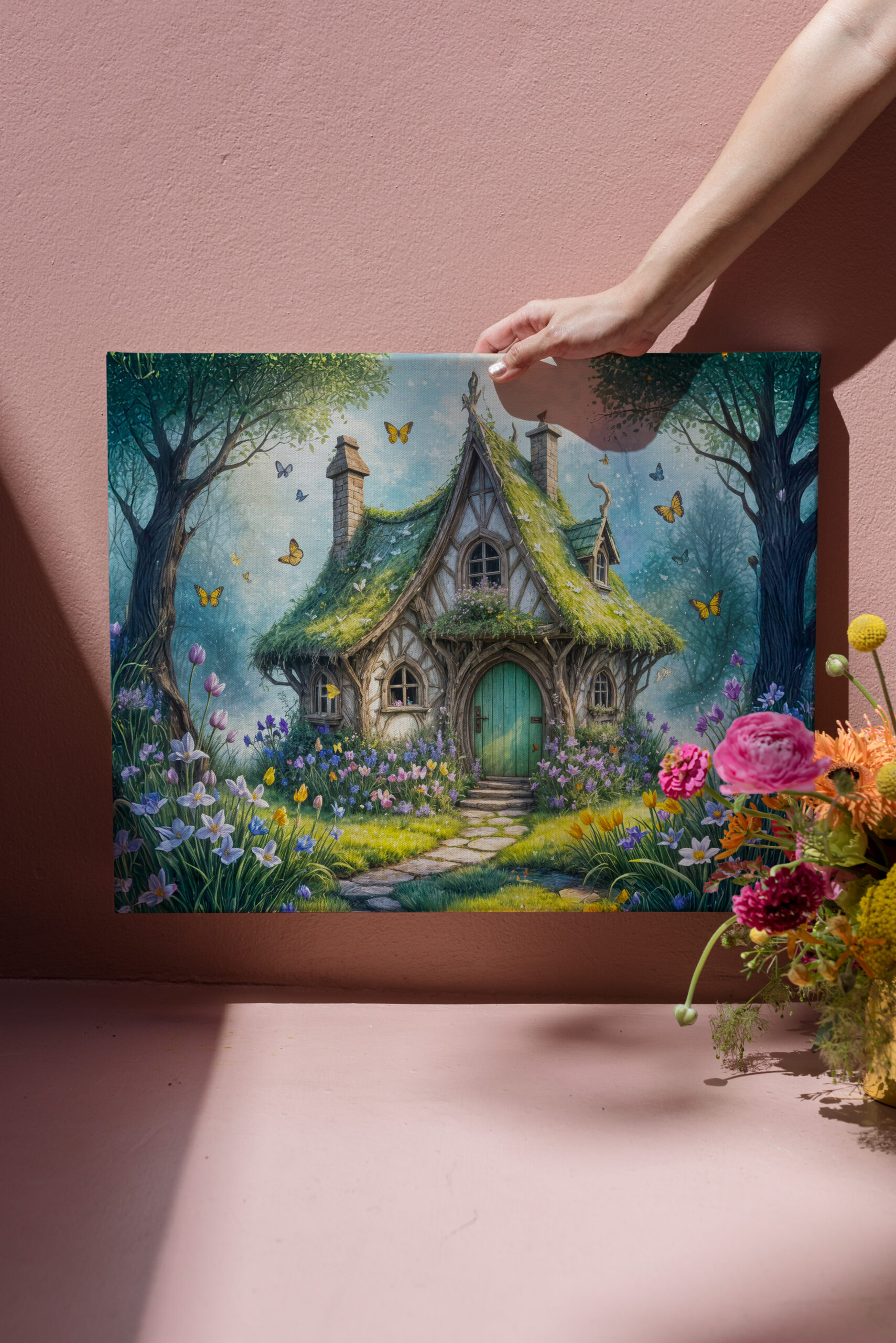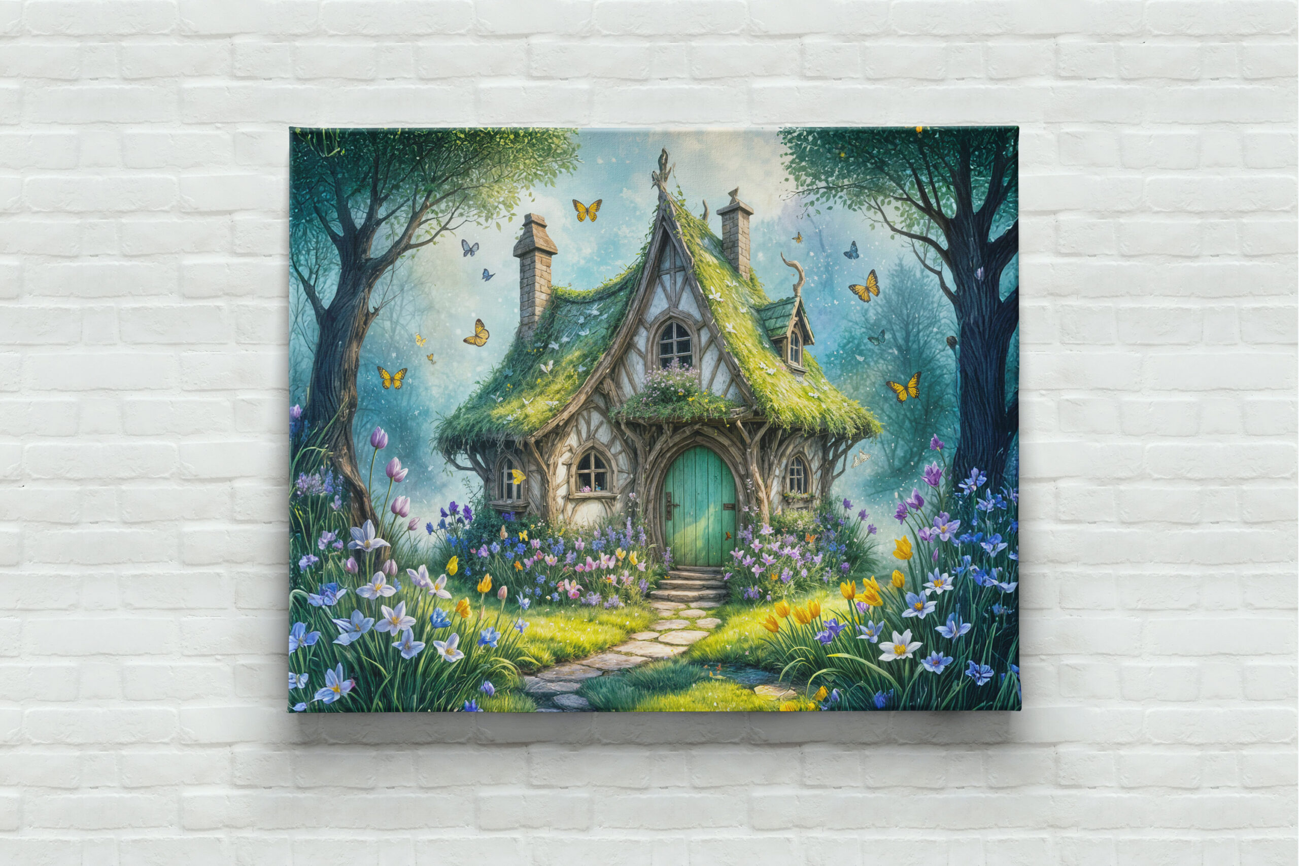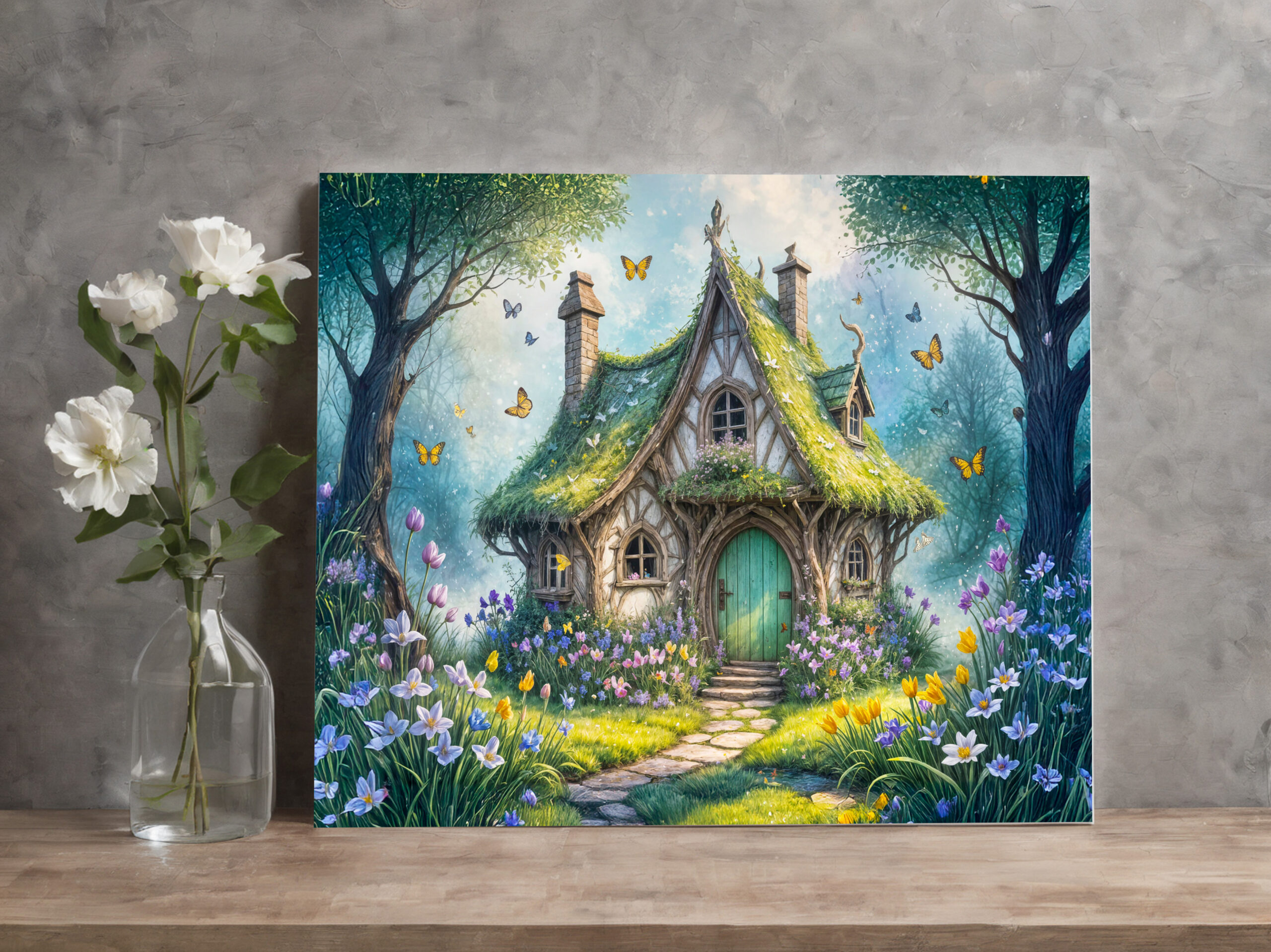 quaint cottage surrounded by a lush garden of crocuses, with vibrant colors and serene nature, creating a magical and peaceful setting.