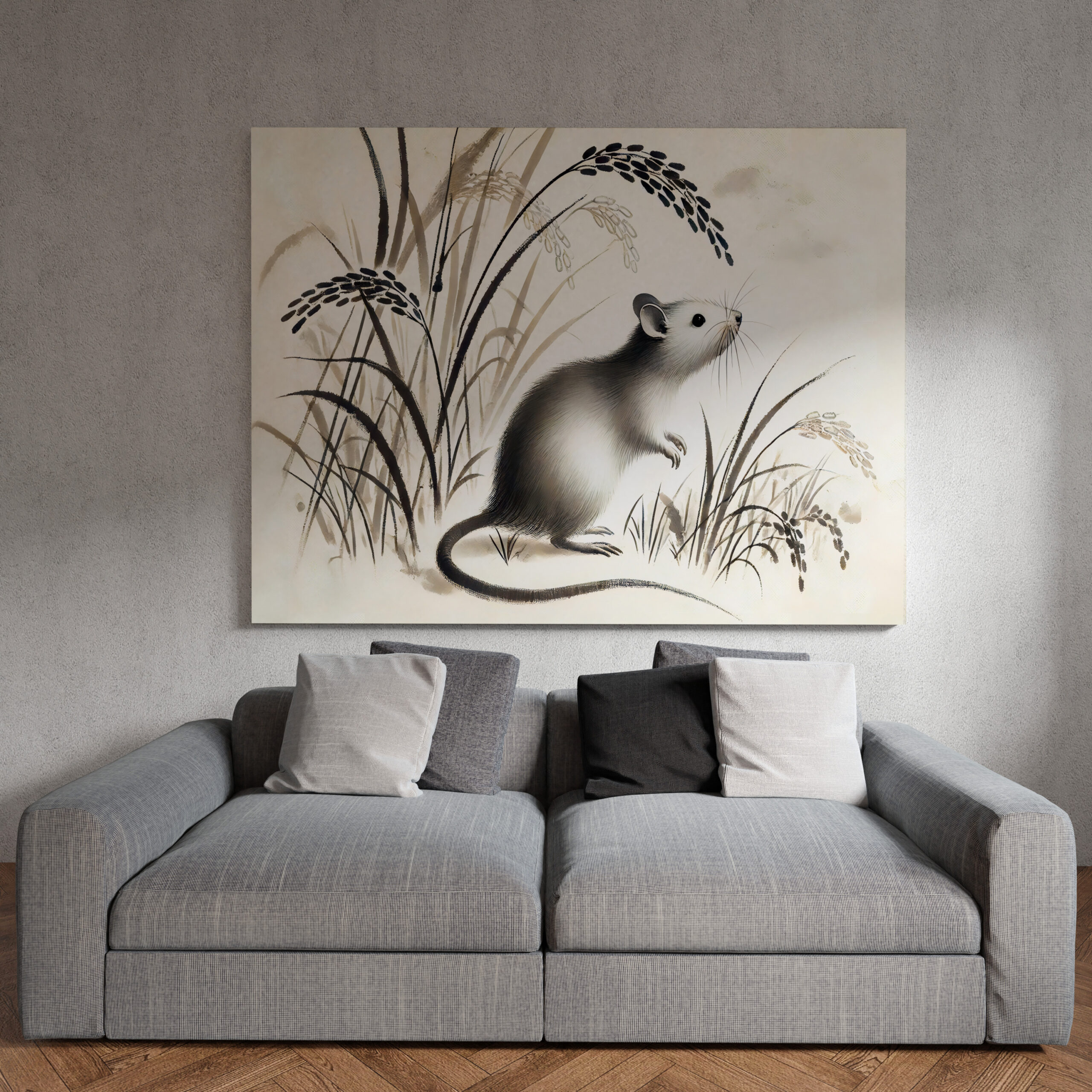 clever rat sits watchfully under a rice plant in this detailed ink drawing.