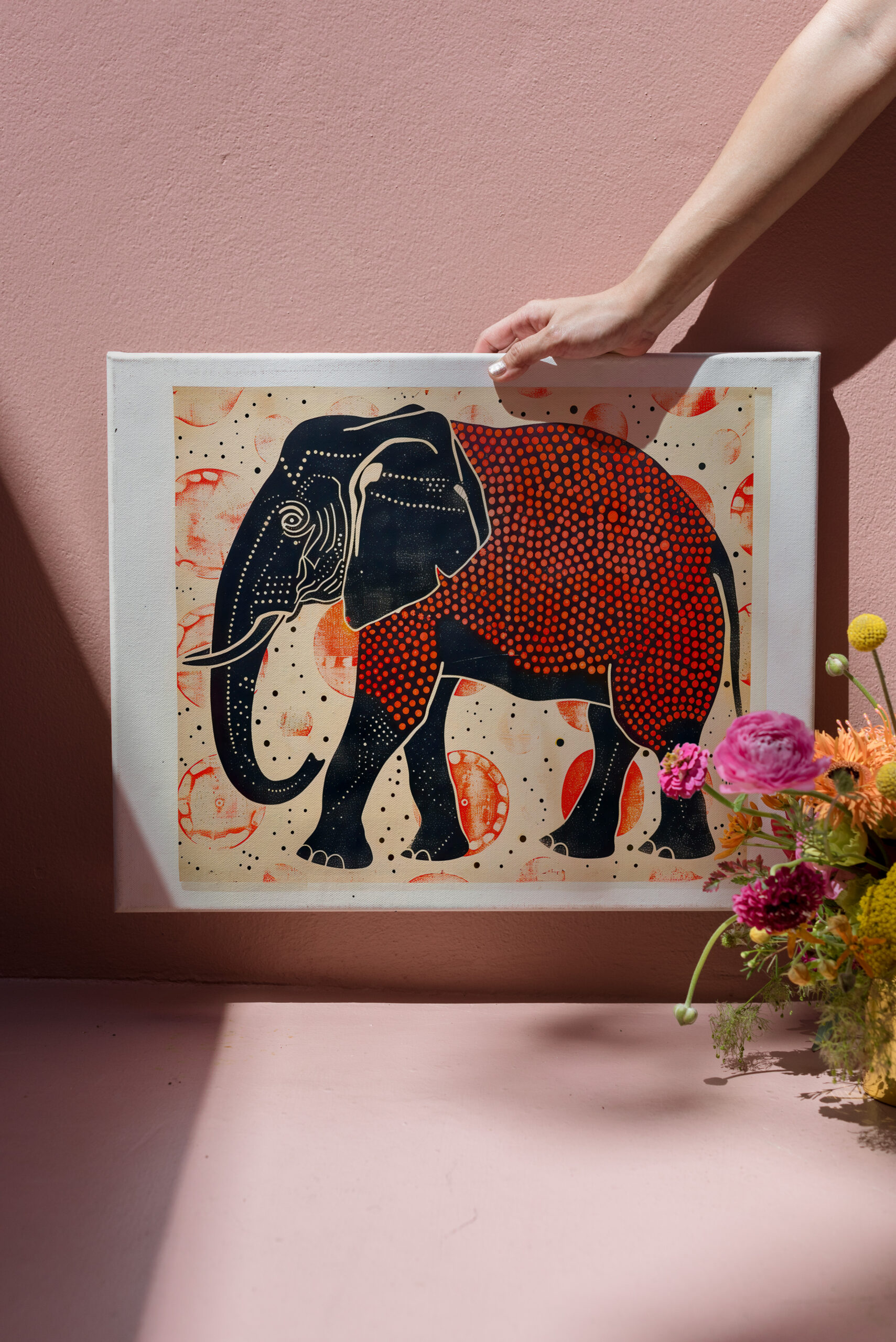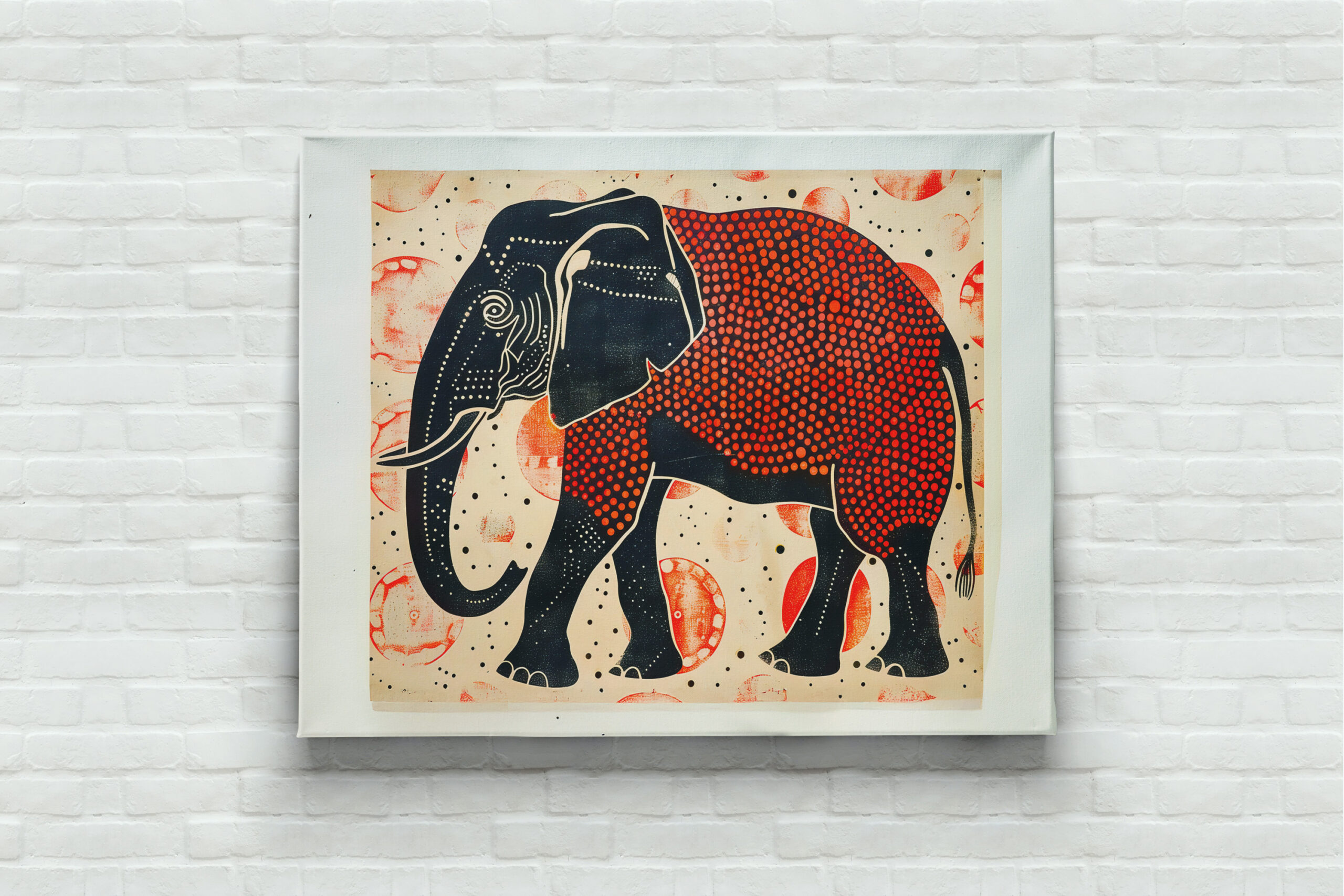 minimal yet expressive abstract elephant in black and red with dotted outlines. Strong contrast and symbolic shape.