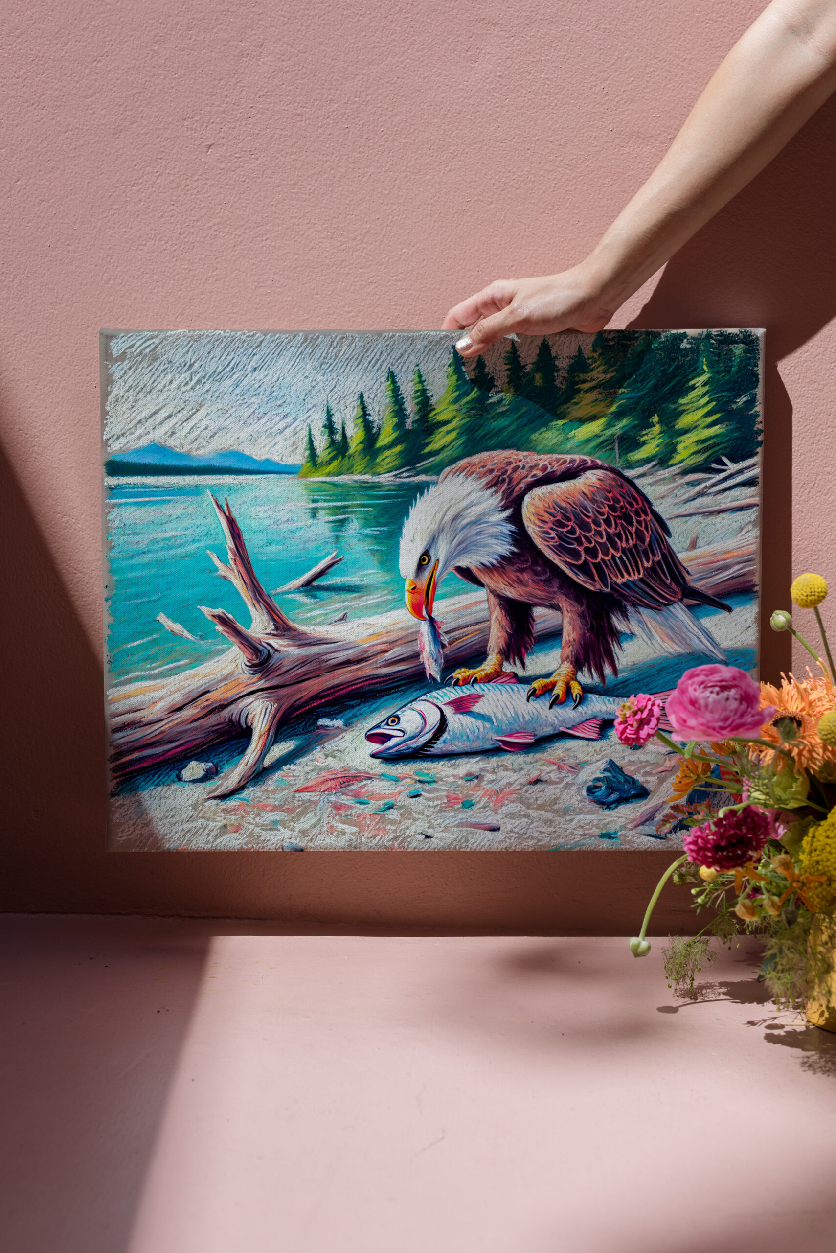 majestic eagle enjoys its meal at the riverbank, tearing into a freshly caught fish. This pastel chalk drawing captures a wild and powerful moment, perfect for wildlife and nature-inspired designs