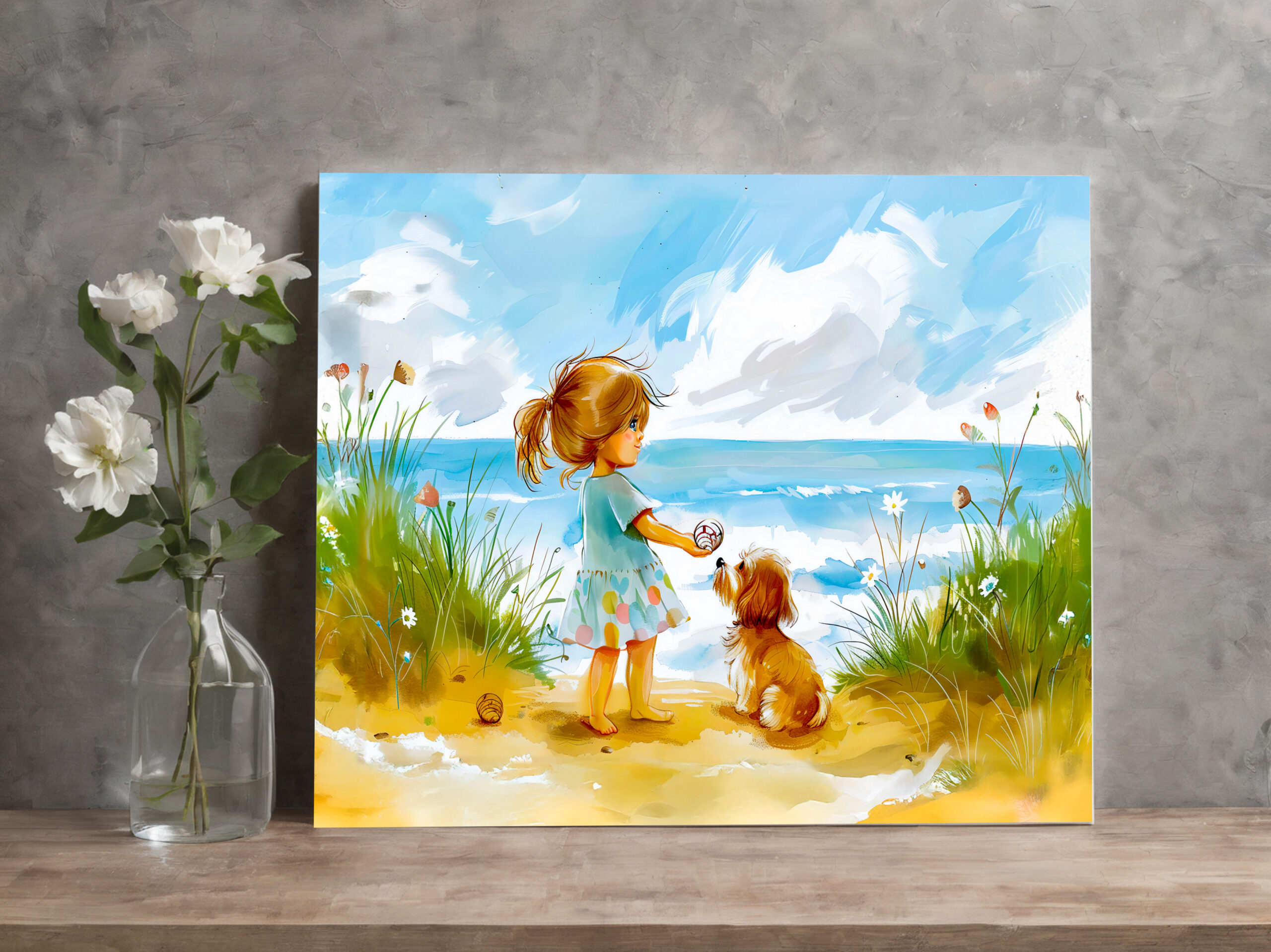Watercolor painting of a young girl and her dog playing joyfully by the sea under a bright blue sky.