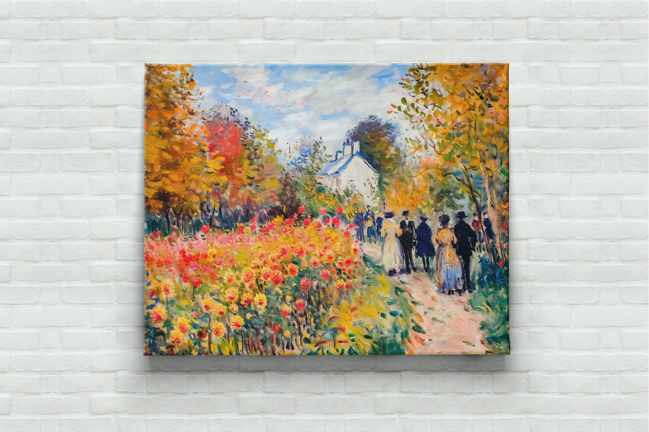 Impressionist painting of a group strolling through an autumn garden, colorful flowers and warm seasonal tones all around.