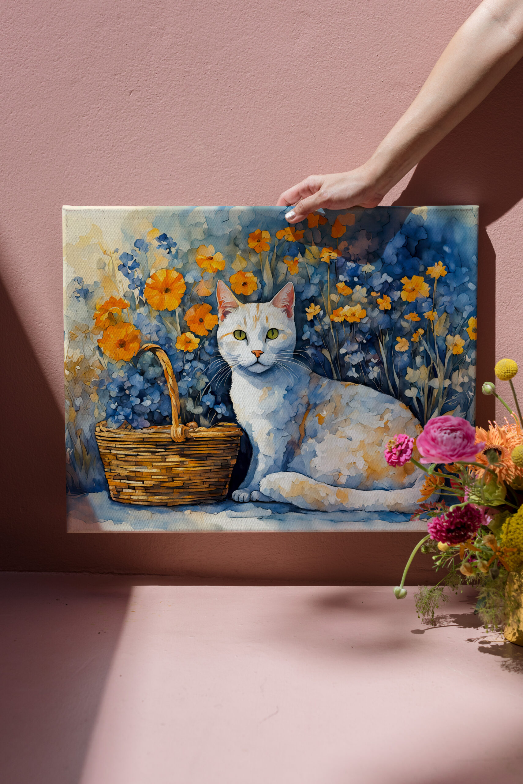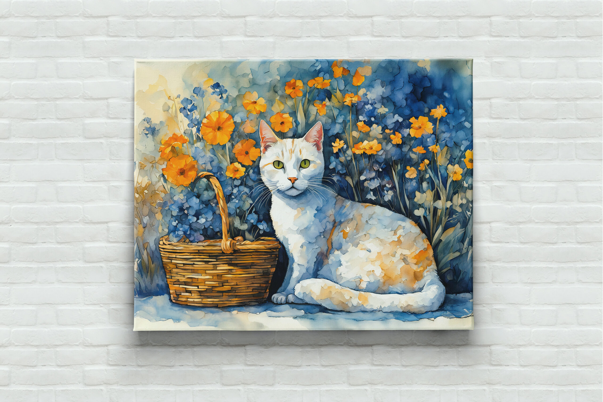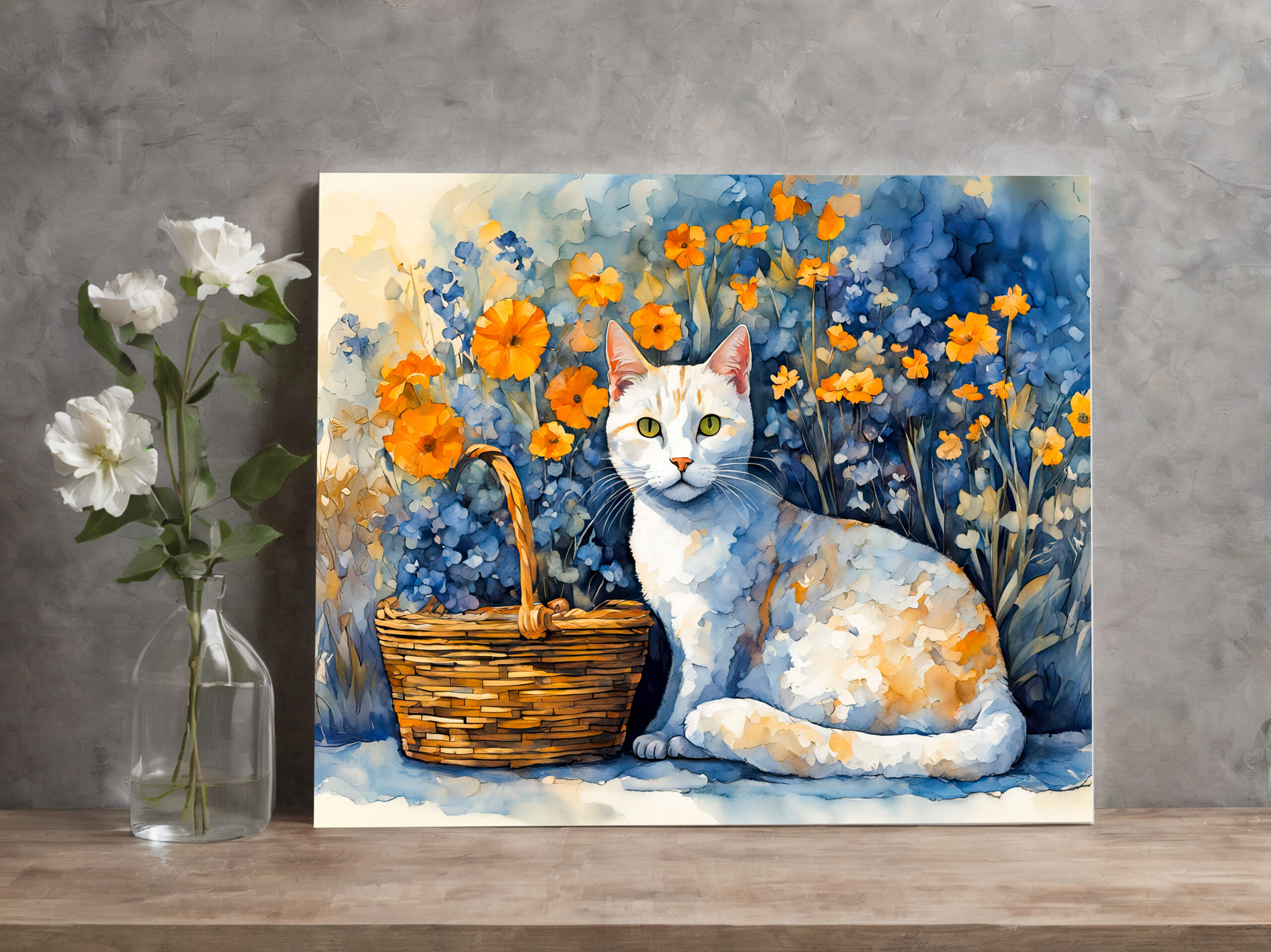 delicate watercolor painting of a white cat sitting in a flower-filled basket. Soft colors and intricate details make this a charming composition.