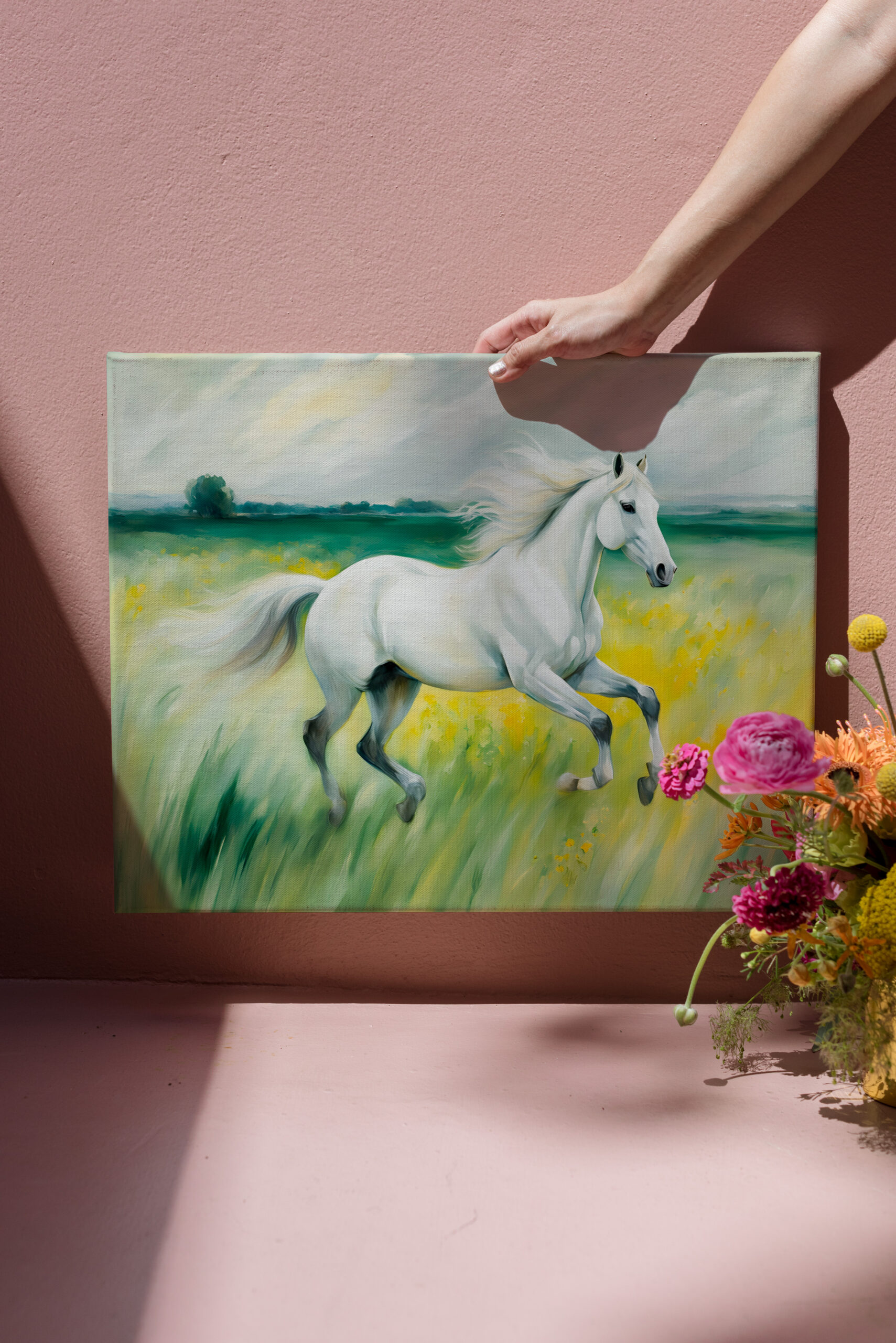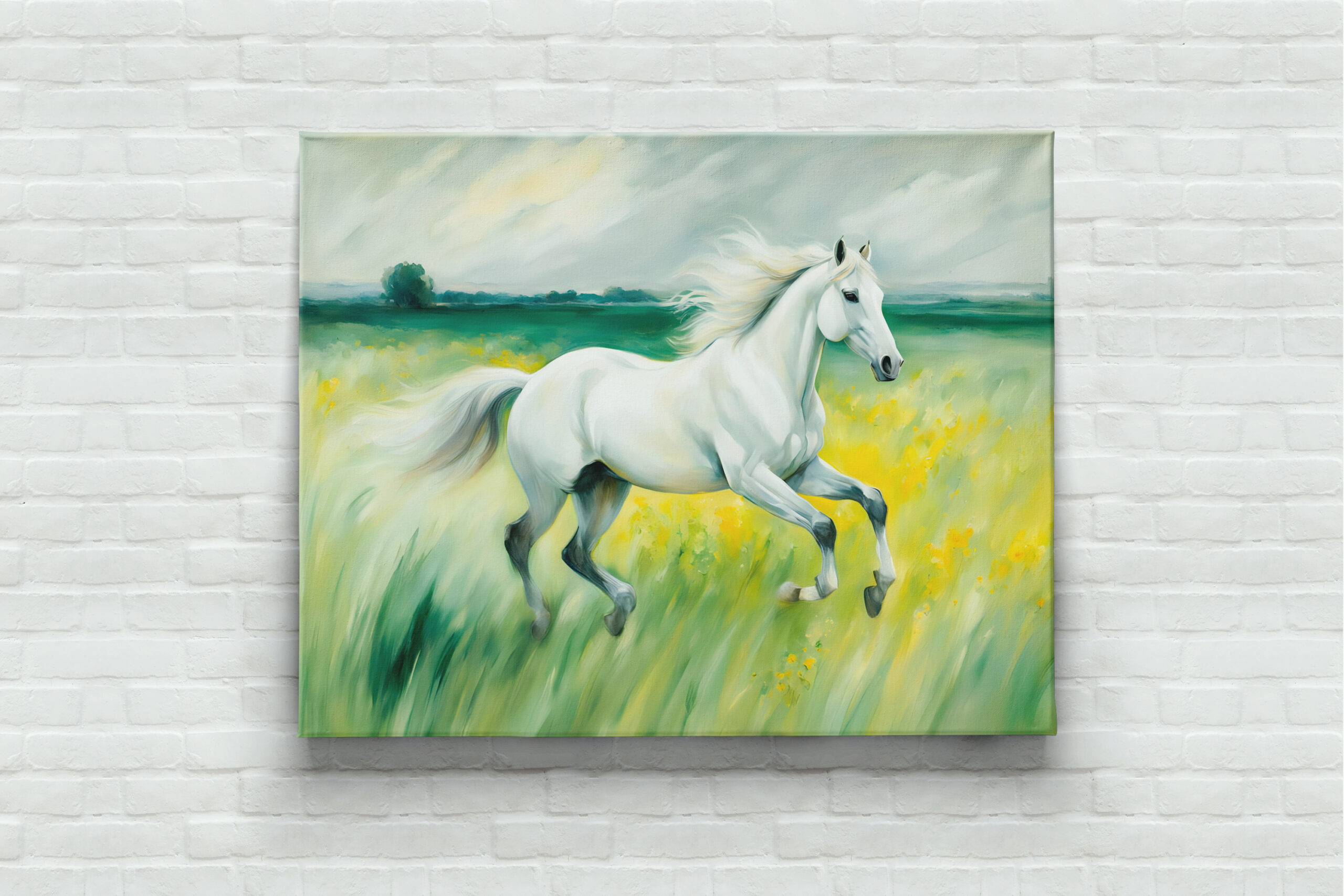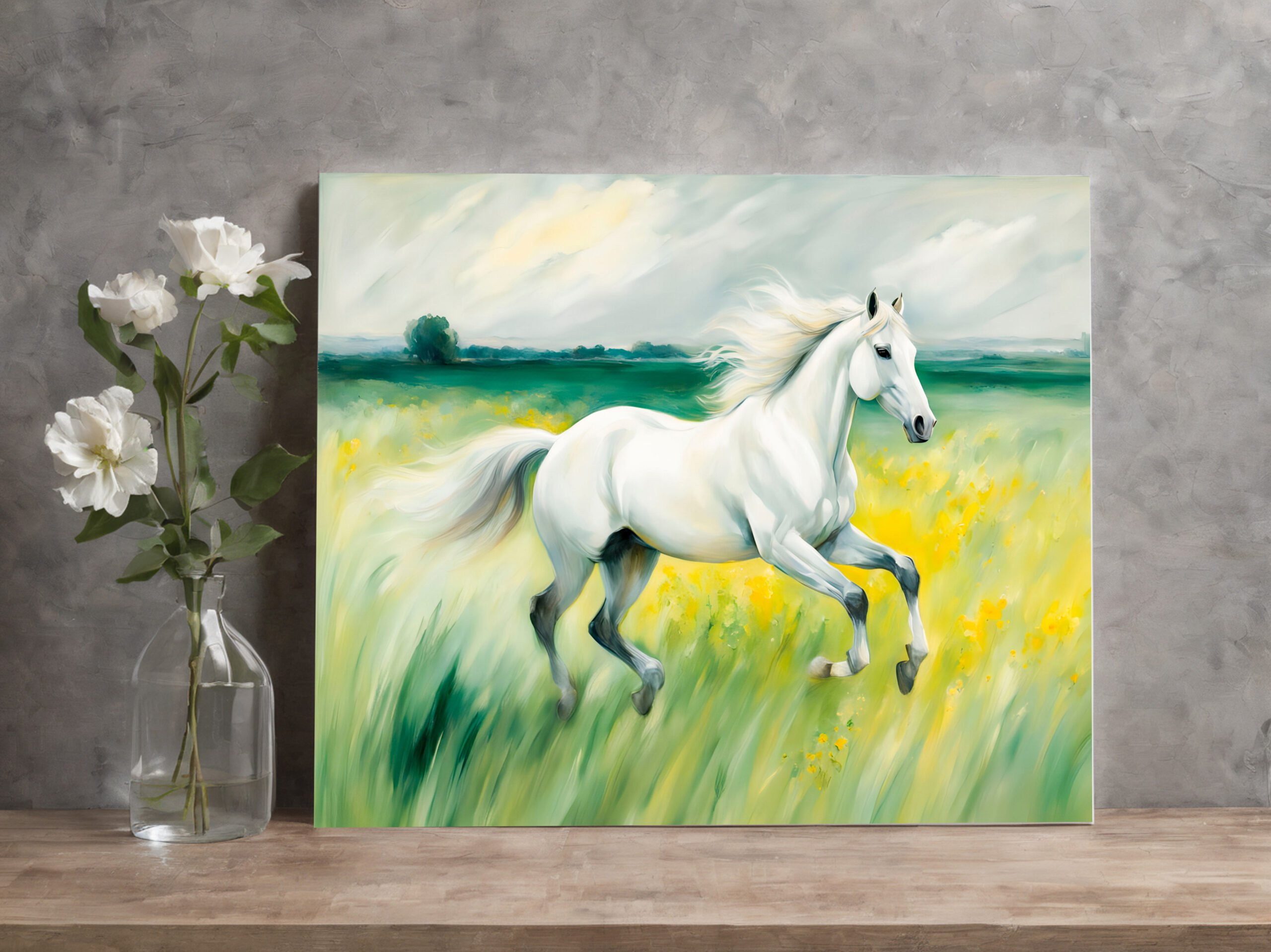 peaceful oil-style painting of a white horse galloping across a green meadow, capturing movement and grace in a natural setting.