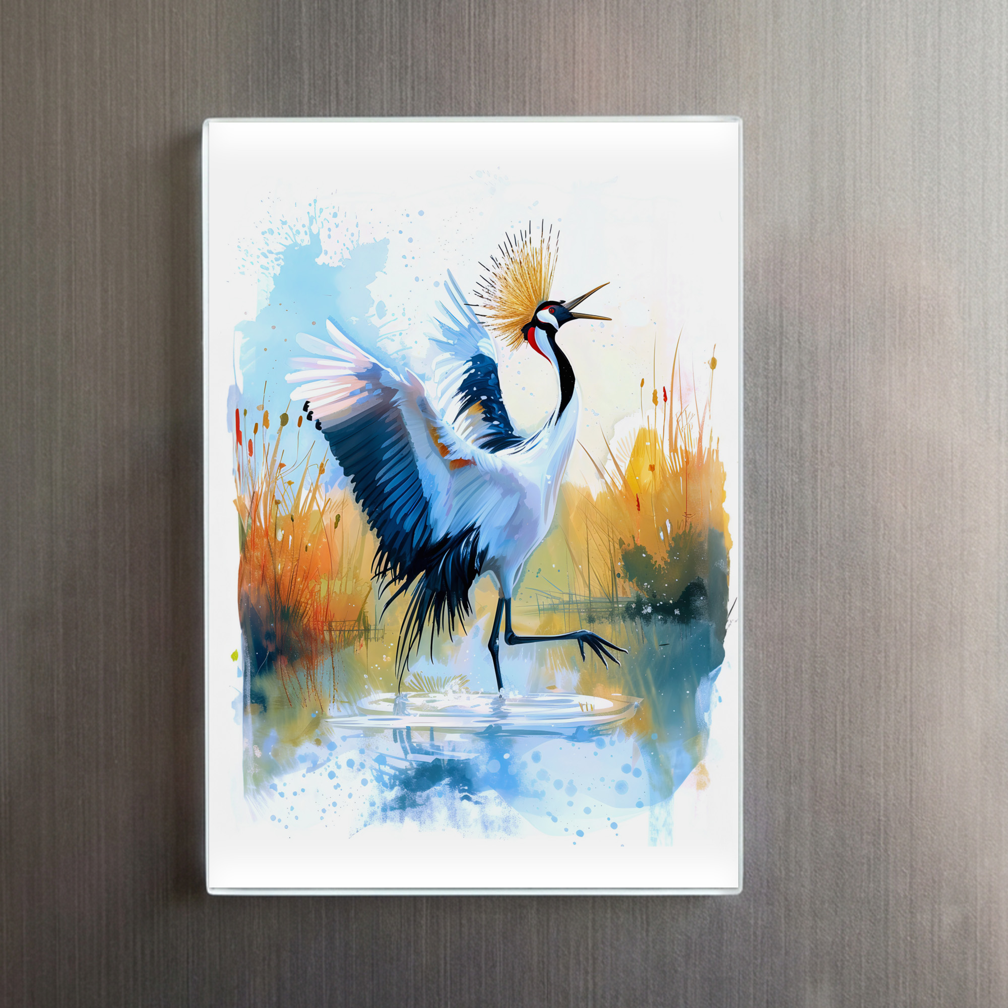 A crowned crane lifts its wings gracefully in shallow water, surrounded by light and movement in watercolor.