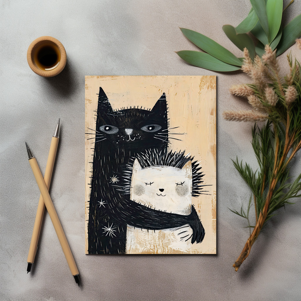 A heartwarming illustration of a black cat gently hugging a hedgehog. The artwork captures a whimsical and affectionate scene with textured details and soft colors.