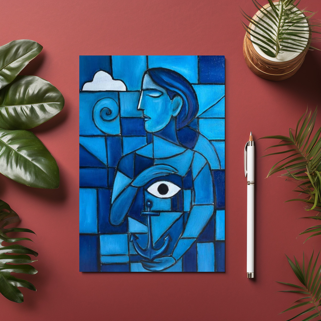 This artwork draws inspiration from the Cubist movement and is meticulously crafted using oil paints. Through this piece, I sought to express both my emotions and my personal narrative. The spiral motif alongside the dominant blue hues embodies my profound connection to the sea, a bond deeply rooted in my late father’s service in the navy.