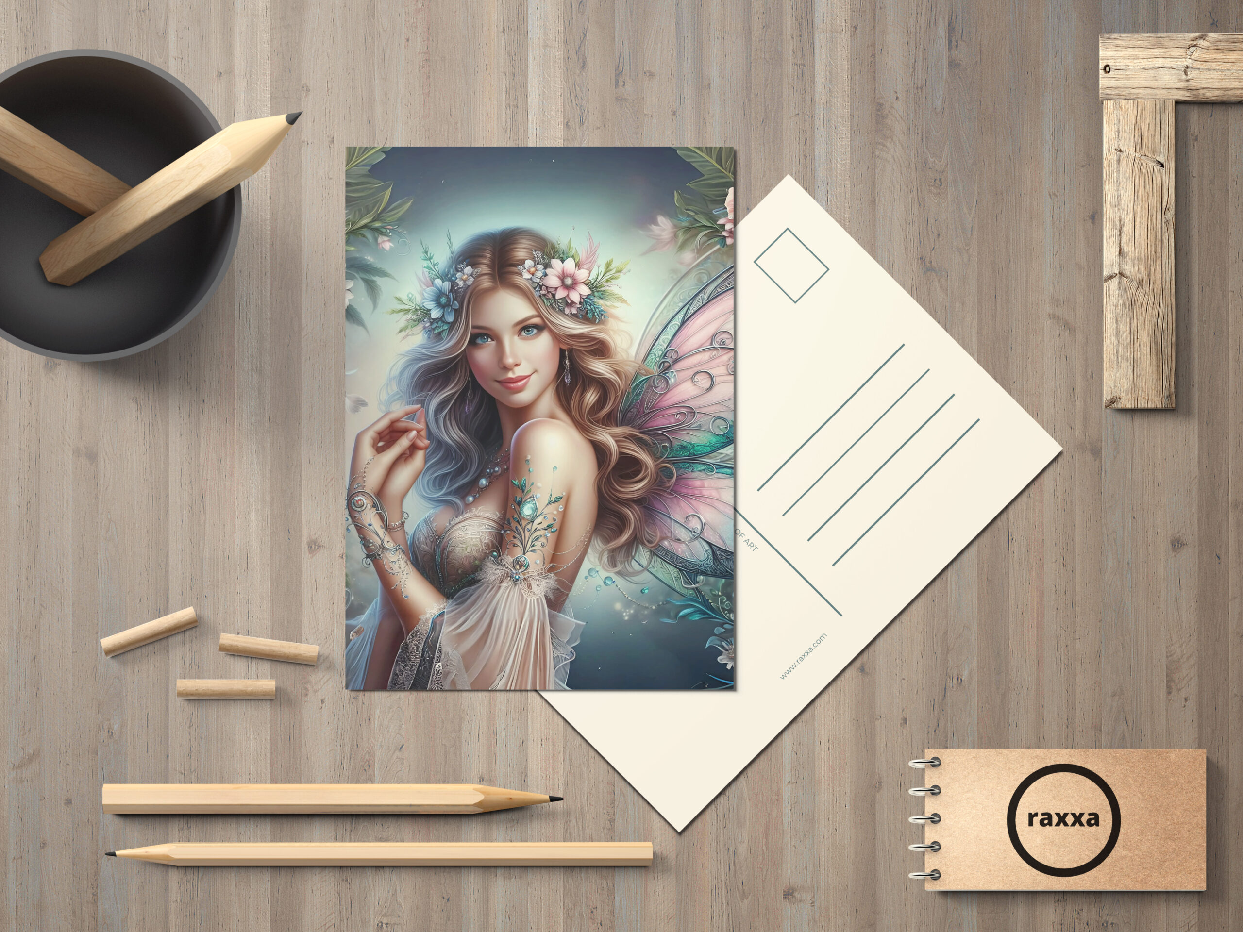 The Fleur picture shows a dark blonde fairy with shimmering wings and a delicate flower arrangement in her hair. She radiates grace against a blue, mystical background. Her eyes glow with mystery and her beautiful smile enchants the viewer in a magical aura.