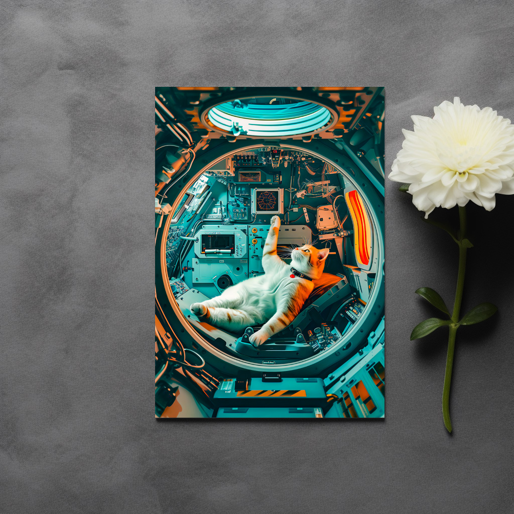 "Orange and white cat in spacecraft cockpit" by Anja Frost