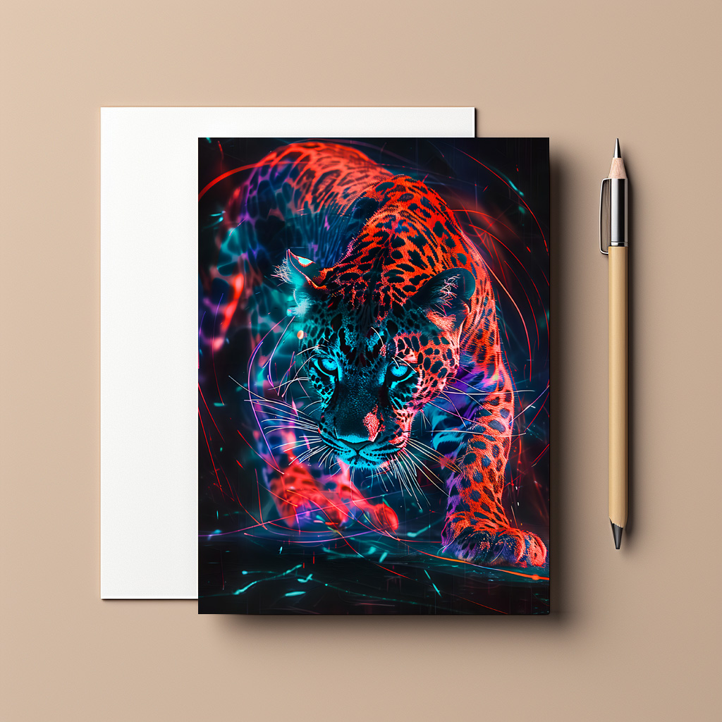 leopard bathed in reddish neon light trails, evoking a cosmic and enchanting atmosphere.