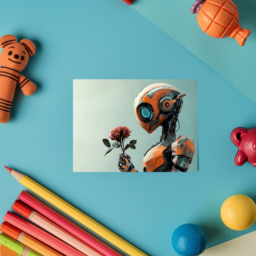 This exquisite figurine depicts a futuristic robot holding a delicate bouquet of red roses, symbolizing the perfect interplay between technology and nature.