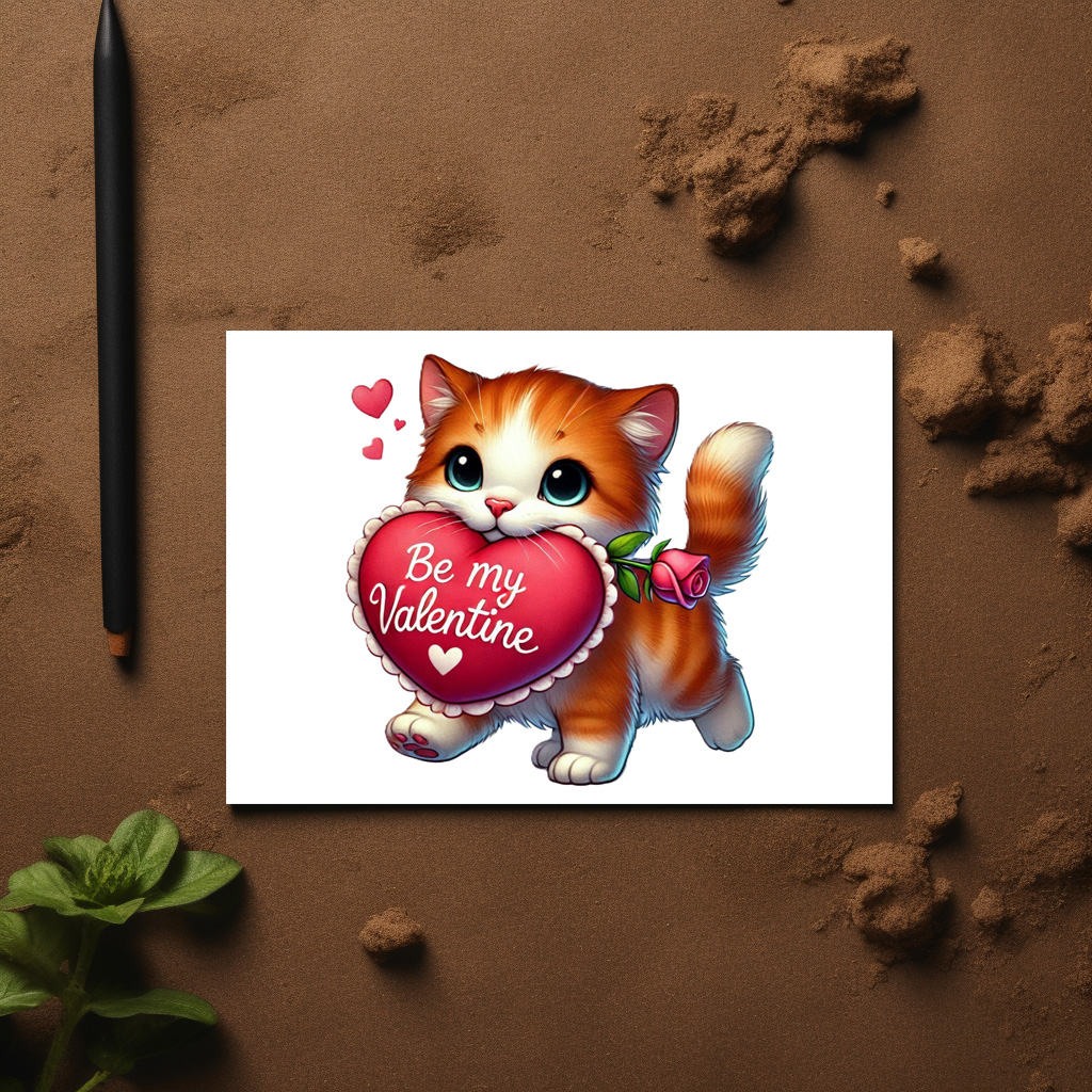 This picture shows a cute orange cat wearing a heart with the words "Be my Valentine" and a rose in its mouth.