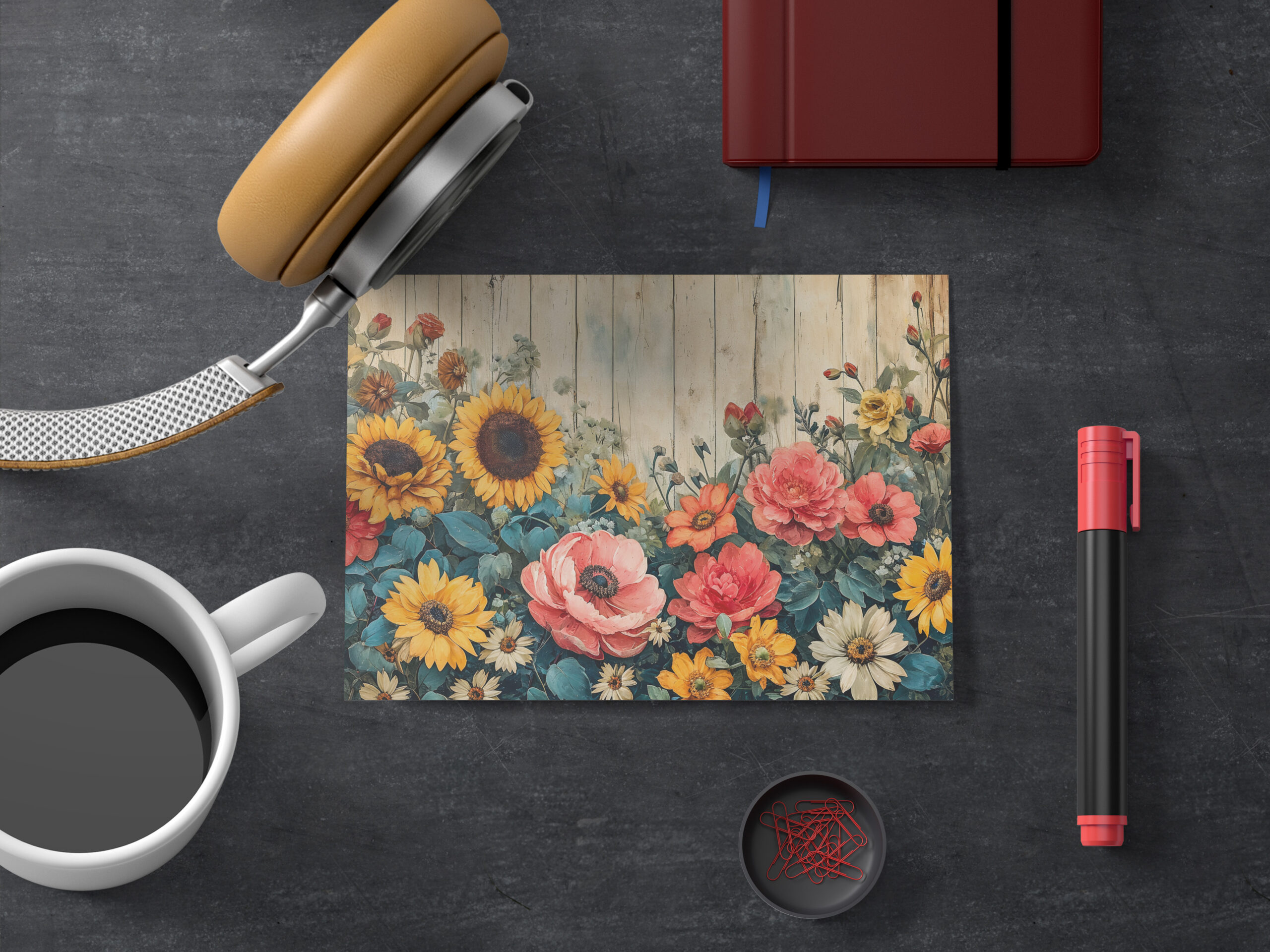 garden-inspired mix of bold sunflowers, soft pink roses, and tiny wildflowers arranged on weathered wood. A cozy rustic bouquet with farmhouse flair.